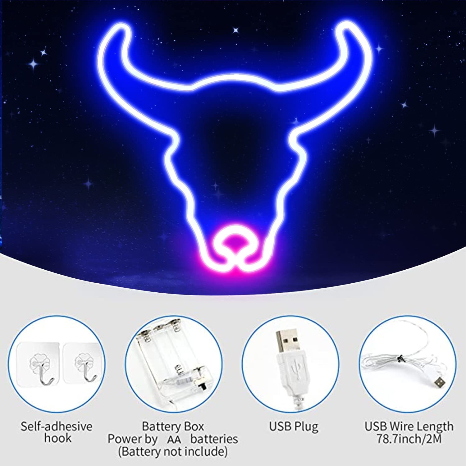 - Quality/Safety/Energy SavingBull head LED signs are made of top quality flexible silicone LED strips and acrylic panels, making the light transmission extremely strong and the light soft and even; our neon signs are made of 3V low voltage advanced electrode system, low energy consumption, long life, no risk of overheating or glass damage when decorating your kids' bedroom.