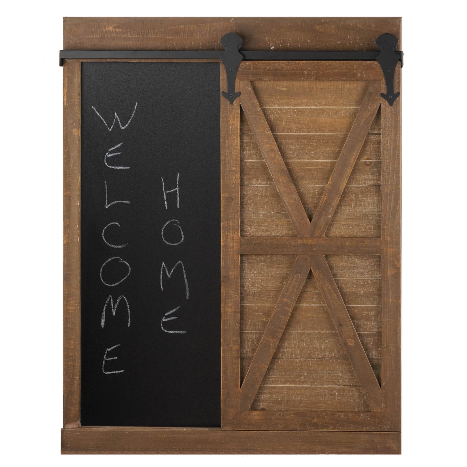- A combination of a functioning barn door that displays a mirror on one side and a chalkboard on the other. Use near the kitchen to make a grocery list or family messages or place in the entryway to greet guests with fun notes. A great housewarming gift or personal home décor piece!