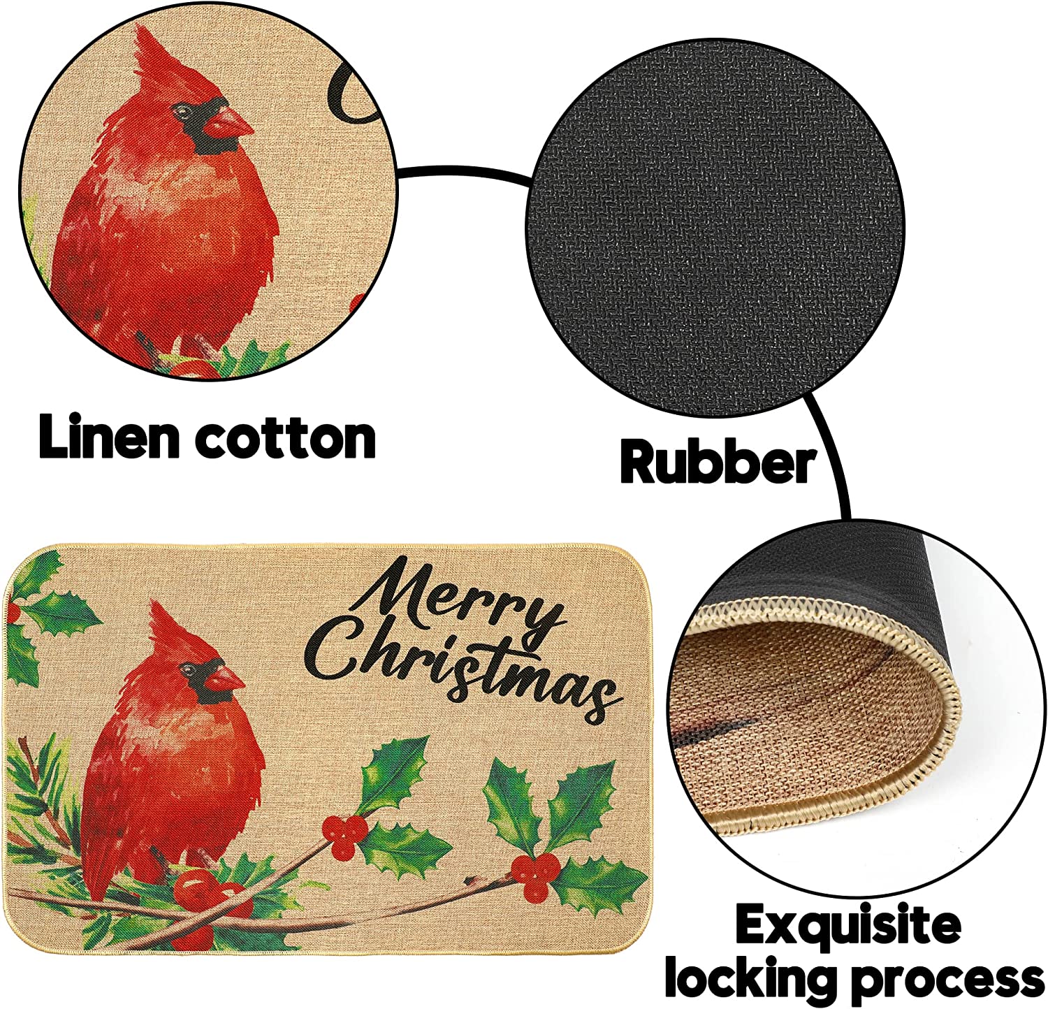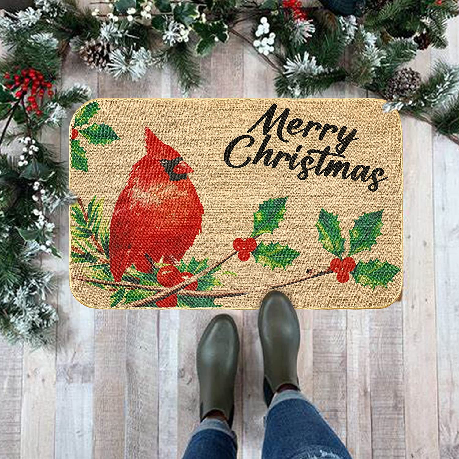 - [DESIGN] - Our Christmas doormat is designed with a Christmas theme image Cardinals Red Birds,which will help you increase the festive atmosphere, nice and beautiful festive decorations for indoor and outdoor