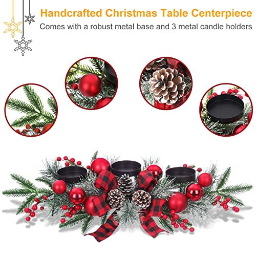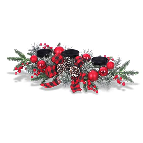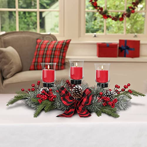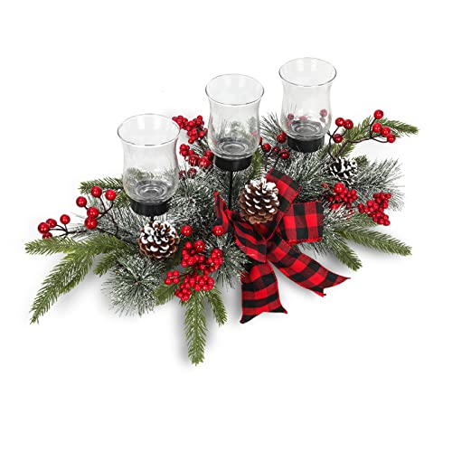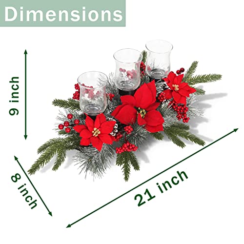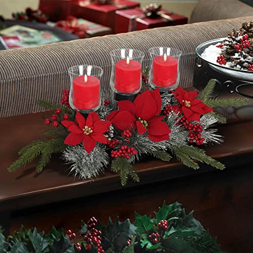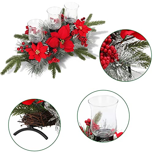 - 【Rich Ornaments】This Christmas centerpieces with a textbook pairing of rich mixed faux poinsettias, snowy pine cones, red berries, pine needles and cedar branches. They create a realistic look and remains fresh year after year and season after season. The metal base is nestled in natural twig, and come with 3 glass hurricane shade candle holders.