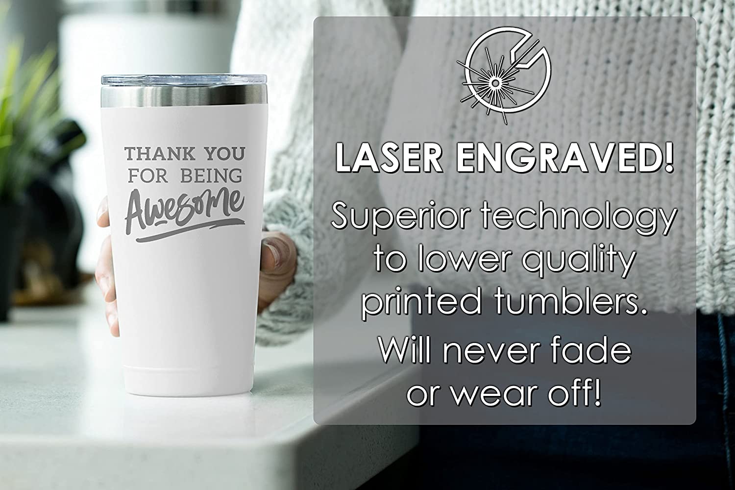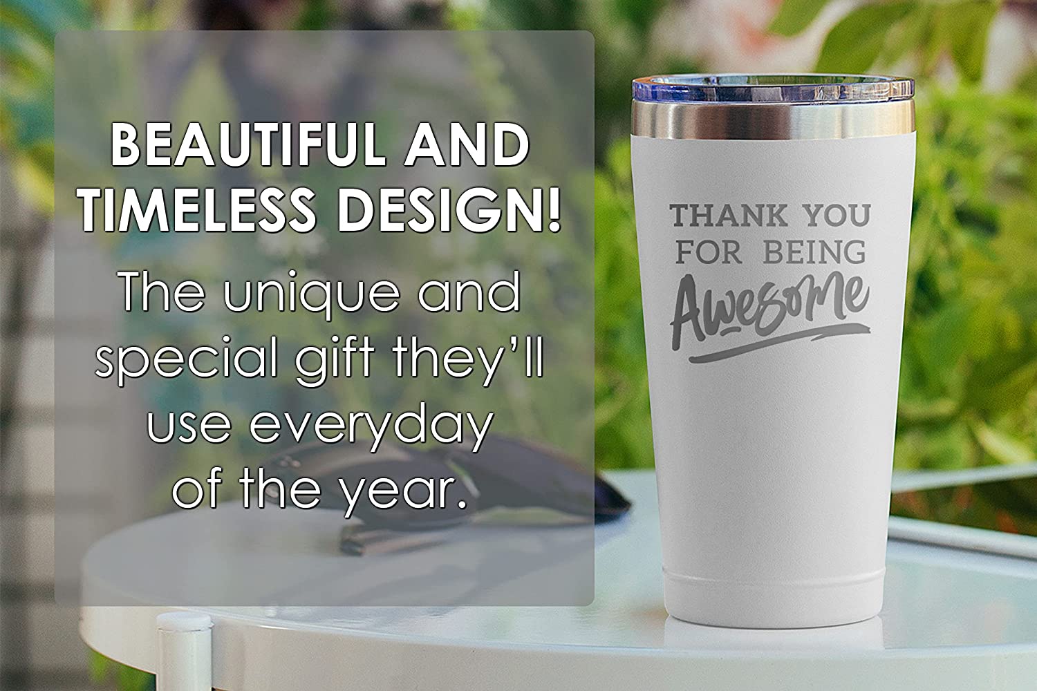 - BEAUTIFUL AND TIMELESS DESIGN. Why settle for a boring gift when you can give them a classy and personalized insulated stainless steel tumbler they can use everyday? Our durable powder coated tumblers are superior to less expensive painted tumblers. The artwork is laser engraved and will never come off or fade. The unique artwork makes it a gift that will never become outdated!