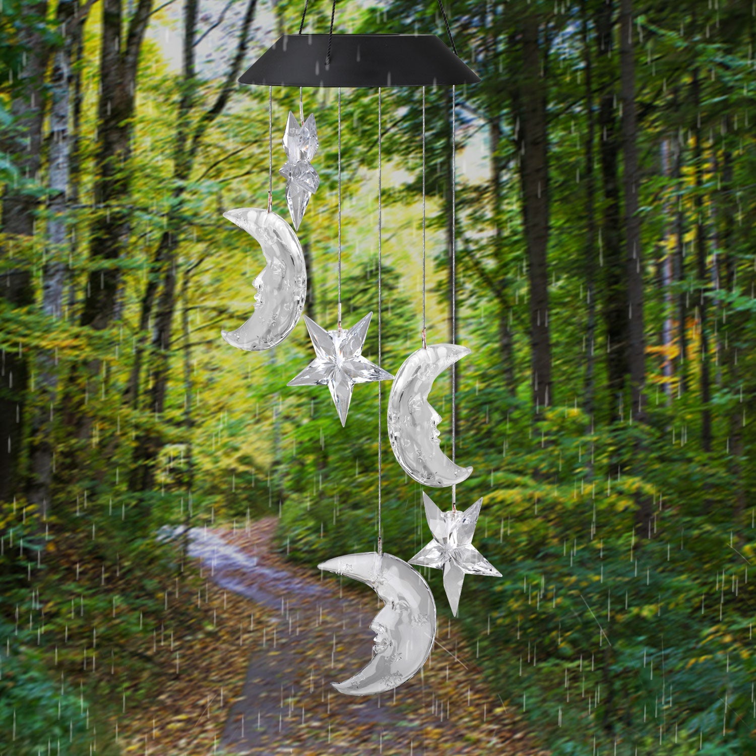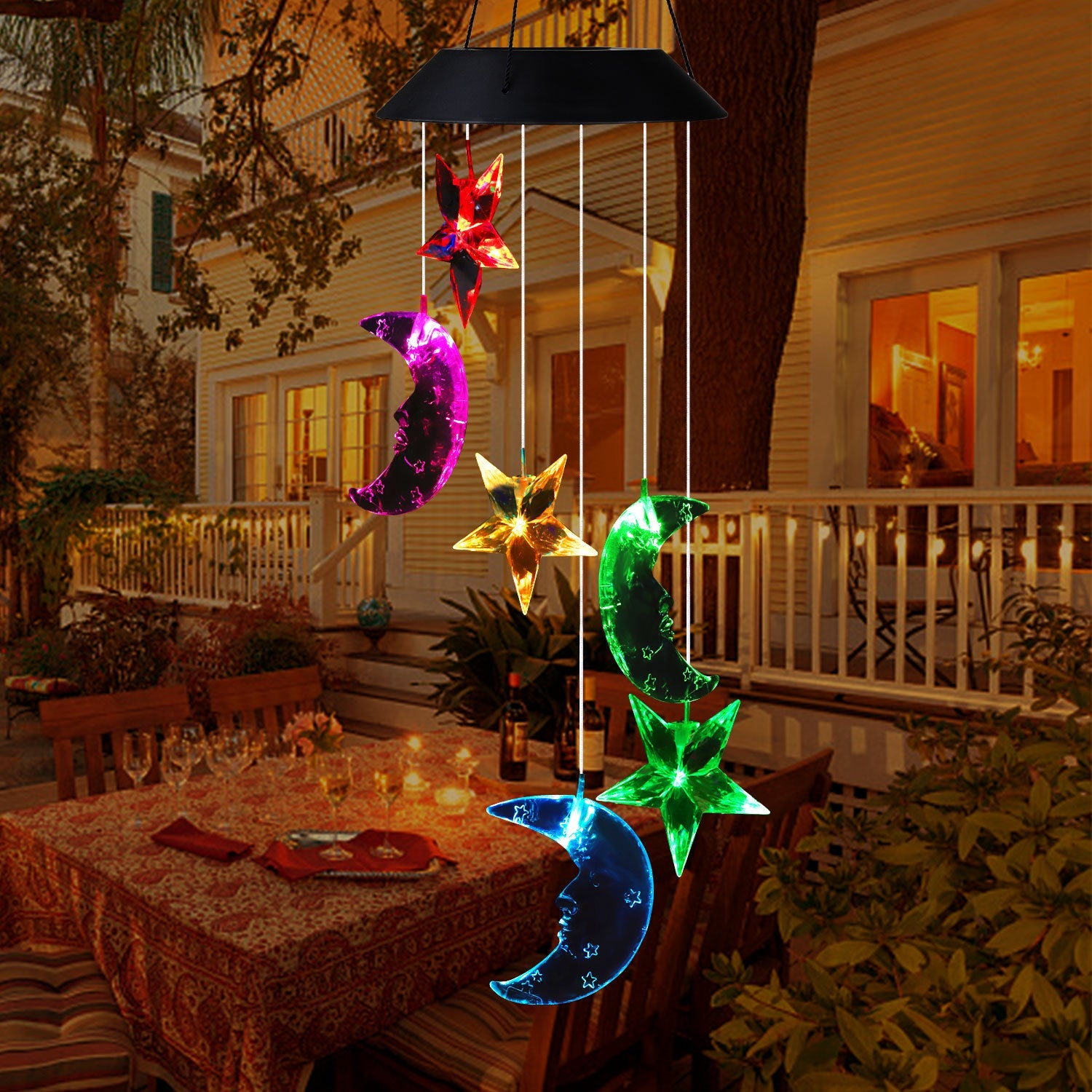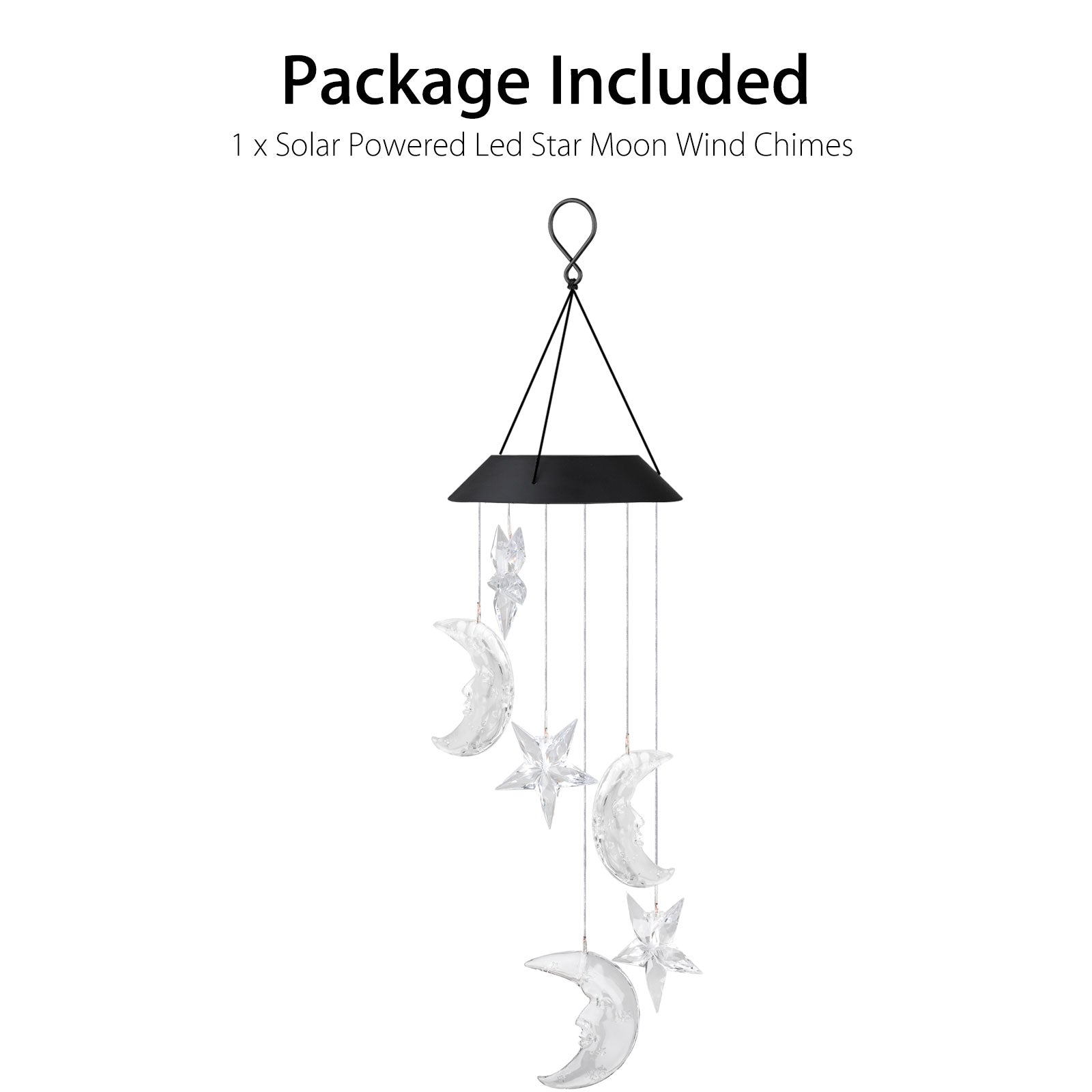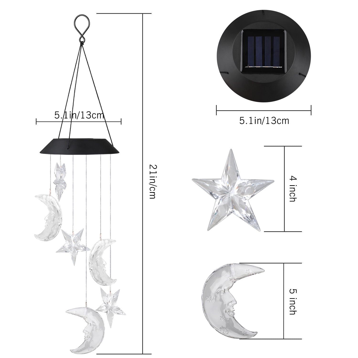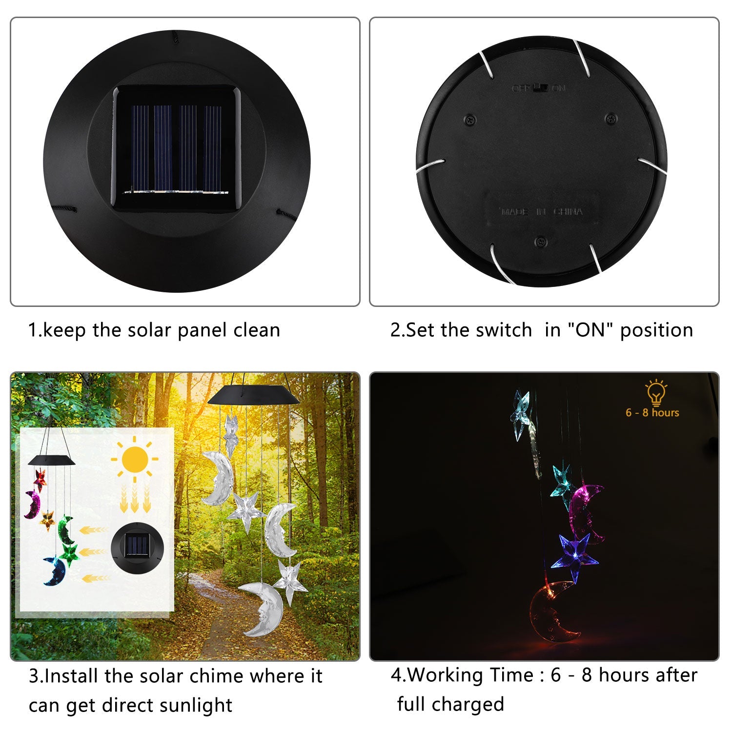 Solar-powered LED star moon wind chimes can auto-charge during the day. The wind light could last up to 6 - 8 hours with fully charged. Lights will light up automatically at night/when dark only, featuring a color-changing LED bulb, calmly and softly changing from one color to the next. The Solar Powered Wind Chime lights will light up automatically with LED color changing. Outdoor star and moon wind chimes have an IP65 waterproof design limited to rain and moisture and do not immerse the product in water for a long time. The romantic star and moonlights can easy to hang from trees, fences, patios, gardens, lawns, living rooms, bedrooms, and other features.Note:1. Since the conversion efficiency of solar panels by the impact of light intensity, so the light string of continuous light time is due to weather conditions, seasonal changes, geographical location, and other factors. This is a normal phenomenon.2. The string can only be charged if "ON / OFF" is set to "ON".4. Please do not violently impact, or beat the product, so as to avoid damage.3. Please notice that the star moon is made of plastic. *- Solar-powered, no wiring or external electricity required for use *- IP65 waterproof and moisture-proof durable for long time use *- Lights will light up automatically at night and charge in the daytime *- Automatic sensor, 7 colors changing for decorative *- The wind light could last up to 6 - 8 hours with fully charged *- S hook to easily hang from trees, fences, patio, garden, lawn, and more. *- High quality pretty memorial wind chime outdoor *- There is a switch under the panel, ON/OFF *- Each super bright LED light can last up to 100,000 hours *- Package Includes: 1 x Solar Powered Led Star Moon Wind Chimes