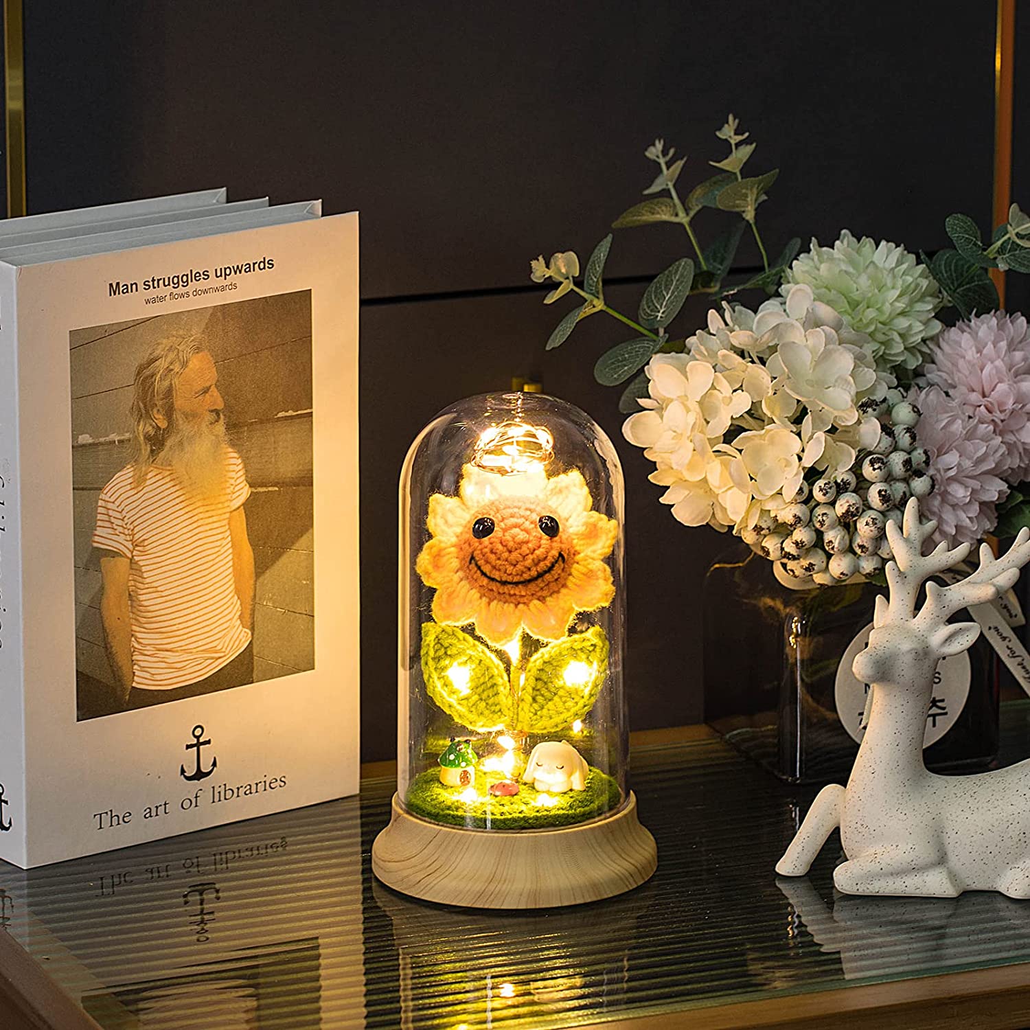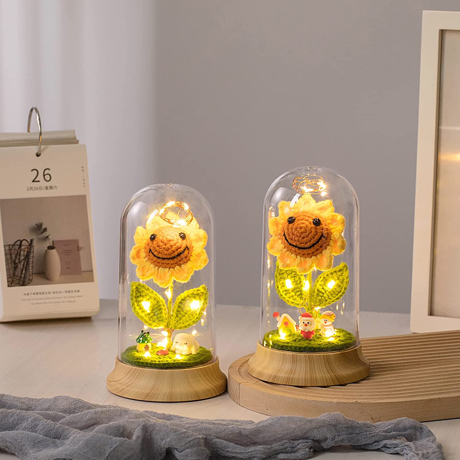 - 1. [Product size and package contents] Box diameter 4.7 inches * 7.5 inches, 1 crochet sunflower, 1 sleeping rabbit, 1 ladybug, 1 mushroom house, 1 2-meter LED light string