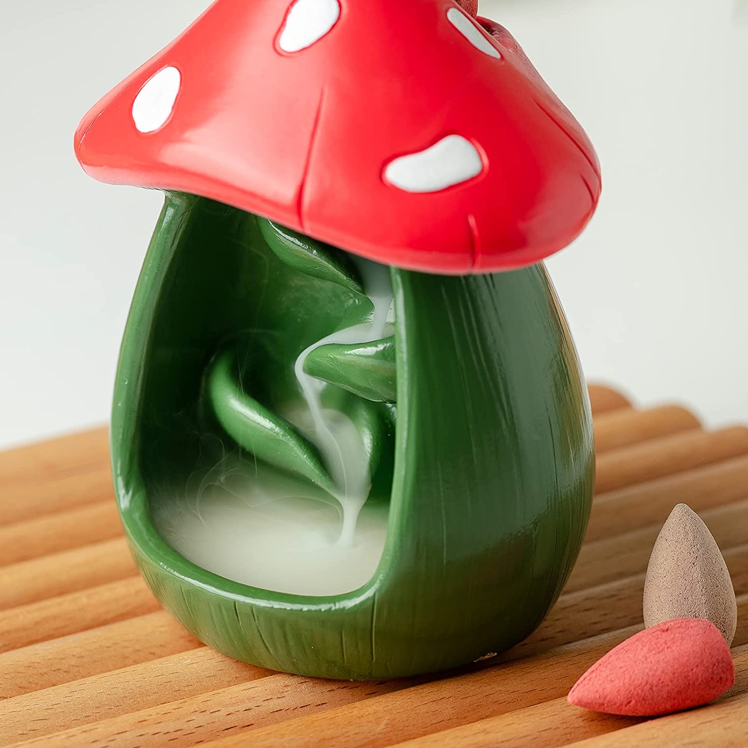 - 🍄CUTE DESIGN: This is a multi-colored mushroom-shaped incense burner. The top of the mushroom is in the shape of a cute umbrella, and the bottom is hollowed out and shaped like a staggered staircase, which can form a visual effect of flowing water like a waterfall of smoke.
