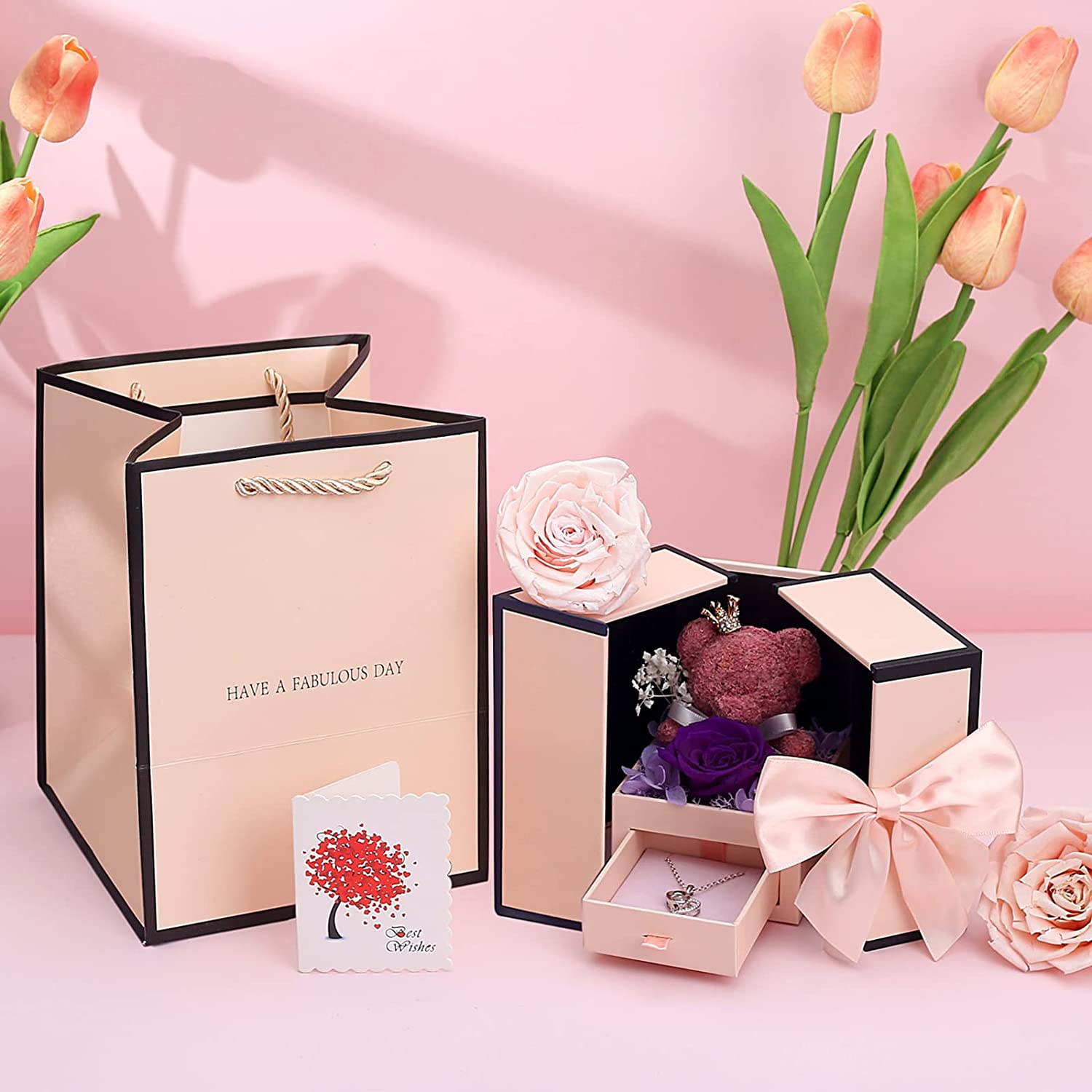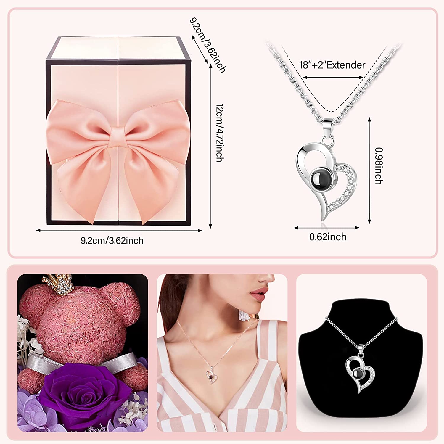 Cute Preserved Real Purple Rose Bear Gifts Box with I Love You Necklace Valentines Day Gift for Her