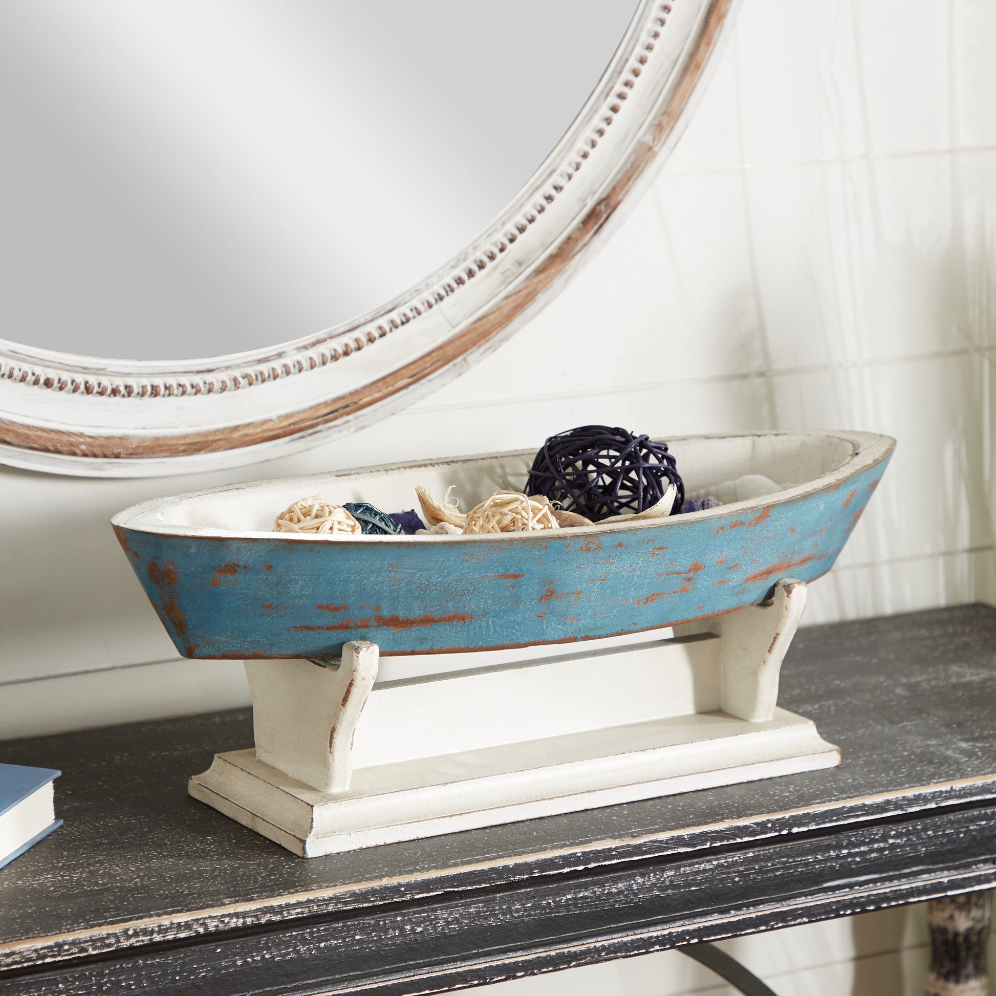 - Features: The sculpture features a boat figure on a rectangle pedestal stand with semi distressed pattern, Wipe clean with a dry cloth, Glued together medium density fiberboard materials