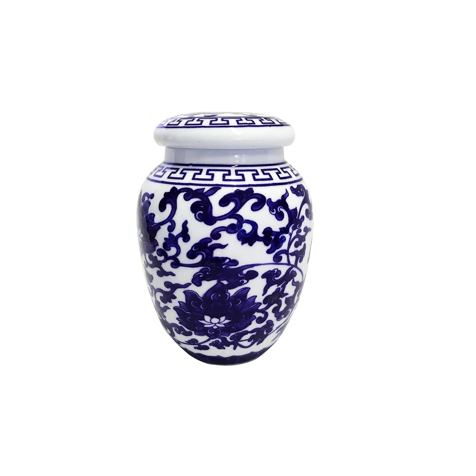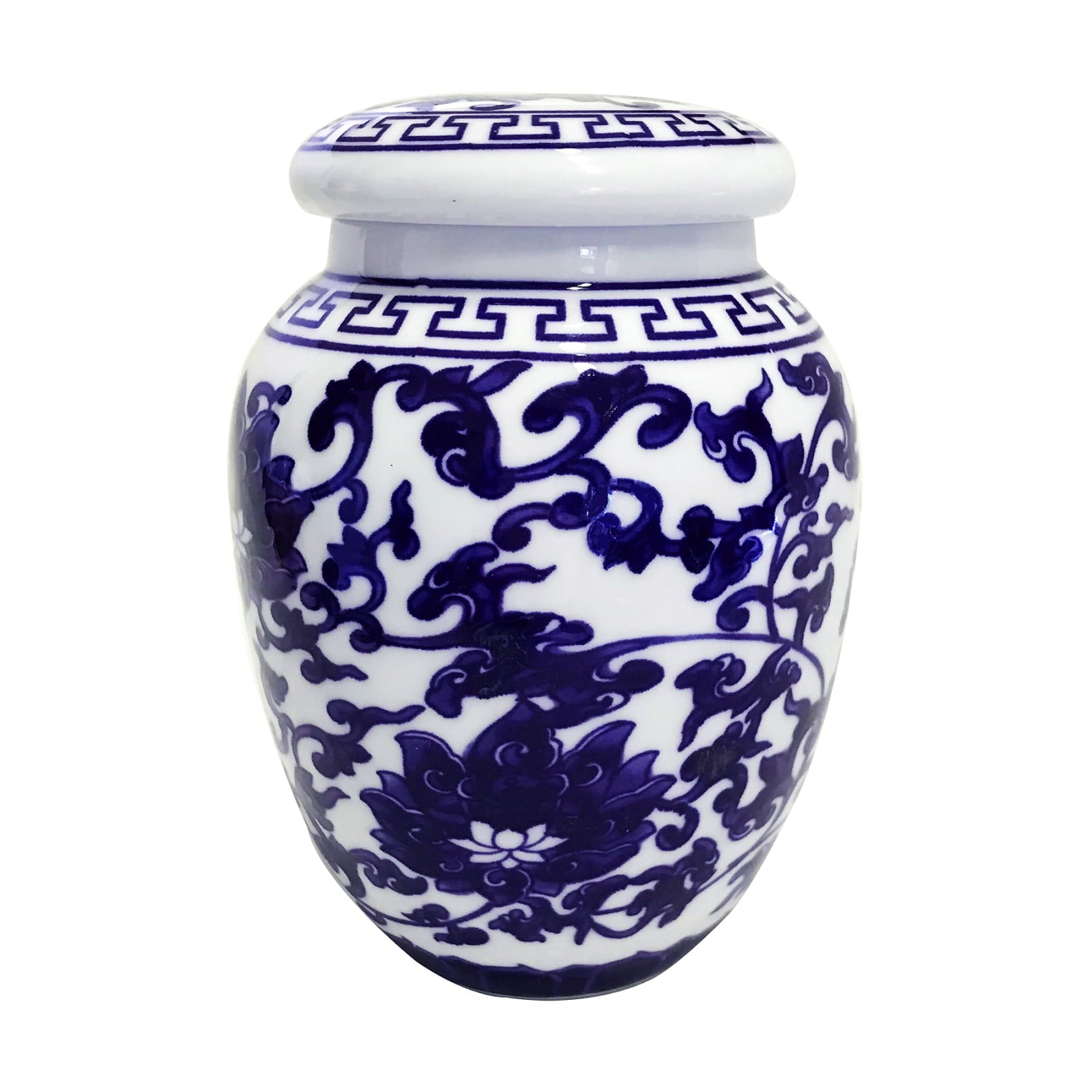 Decorative Traditional Asian blue and white porcelain container with lid. A Ming lotus pattern circles the outside and capped on its lid. Can be used for storage or just a nice display piece. Comes with foiled lid for sealing purposes. Note. Available in 2 sizes.Large size overall measures 5.5 inches tall, 3.5 inches wide. Traditional Asian blue and white porcelain storage container; foiled lid for sealing purposes; Ming era lotus pattern reproduction; Container with lid. Measures 5.5 inches tall, 3.5 inches wide; smooth rounded surfaces.