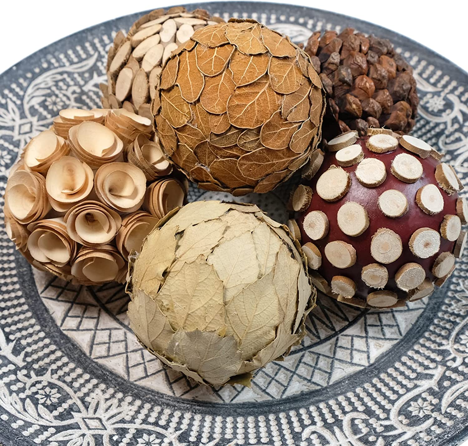 - [100% Natural And Eco-friendly Material Using] After Picking from hundreds of Natural material, we final choose the natural wood piece, wood flower piece, orange color leaves, Ivory leaves and pine cone pieces to make each one filler ball. This kind of Color matches plain and wood floor and furniture.