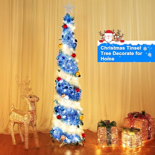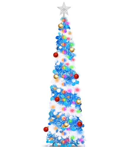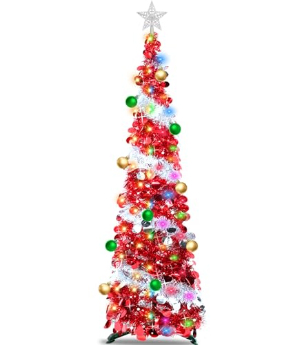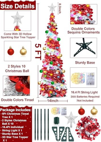 Dual Color Change Lights & Timer - 5 Ft Tinsel Christmas Tree Ball Ornaments Star Pop up Christmas Tree Battery