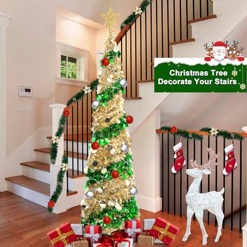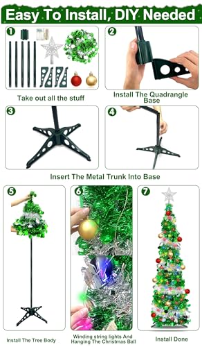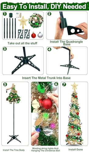 - [ Pop Up Design, Easy to Use ] Features a pull-up design for effortless Christmas preparations. Includes stable Stand. Easy to assemble and take down for storage. No tools needed. Durable and reusable. The star topper satisfy your DIY needs to put it at the tree top.