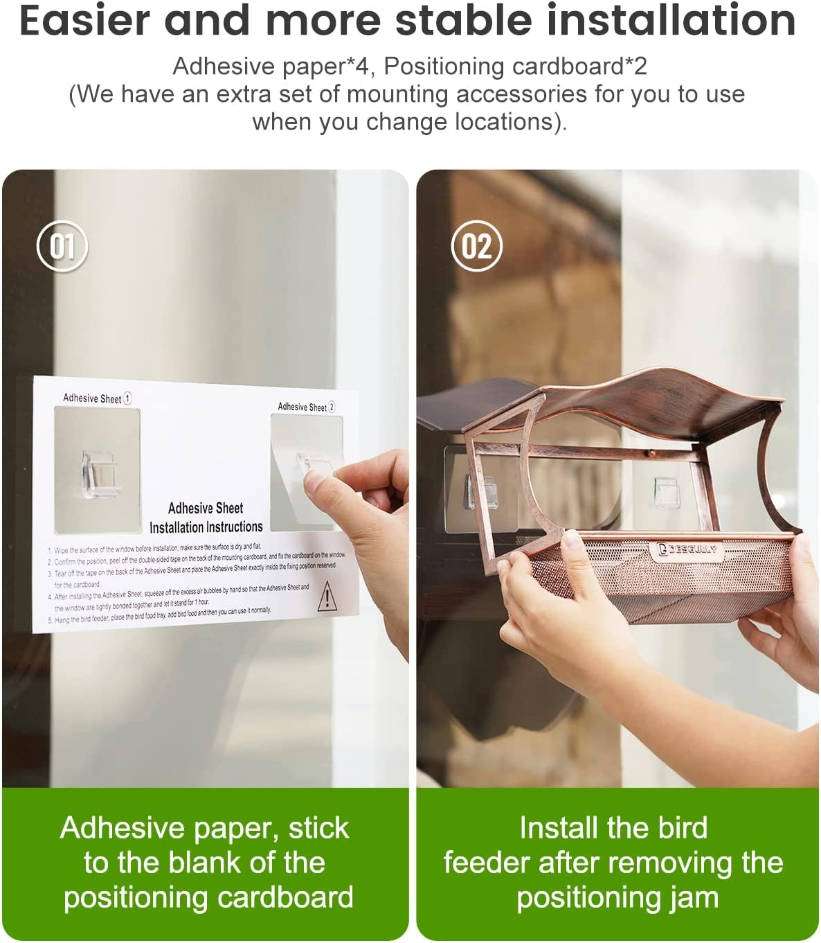 - [Perfect solution to the falling problem]: I know very well that the suction cup acrylic window bird feeder does not have enough adsorption power, and I don't know when it will fall from a high place; this time we have paired it with super strong Adhesive paper, which perfectly improves the stability, so you don't have to worry about falling anymore. (Adhesive paper*4, positioning cardboard*2, we also have an extra set of mounting accessories for you to use when changing the position).