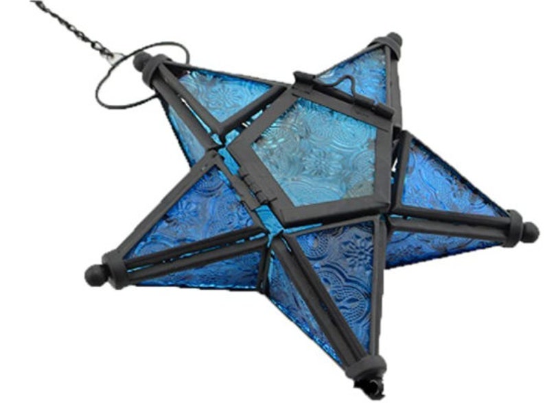 Elegant Sapphire Star Lantern and Glass Candle Holder, Vintage Blue