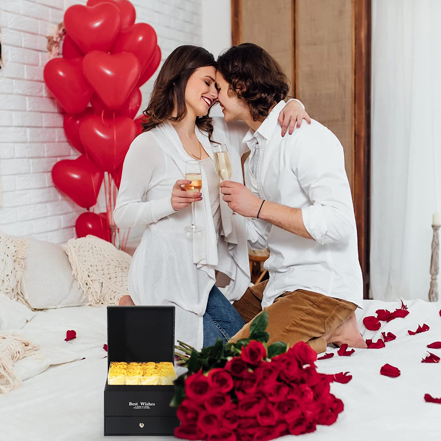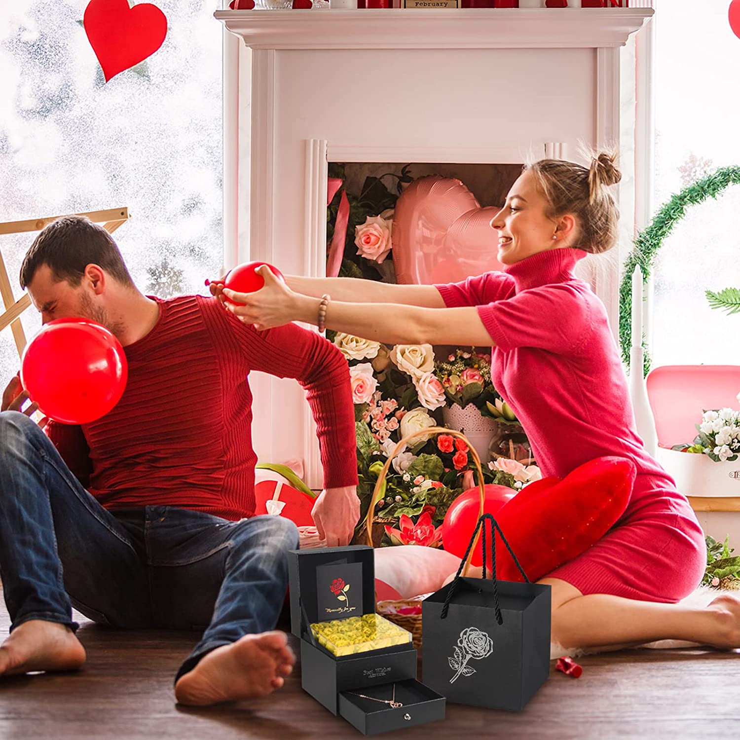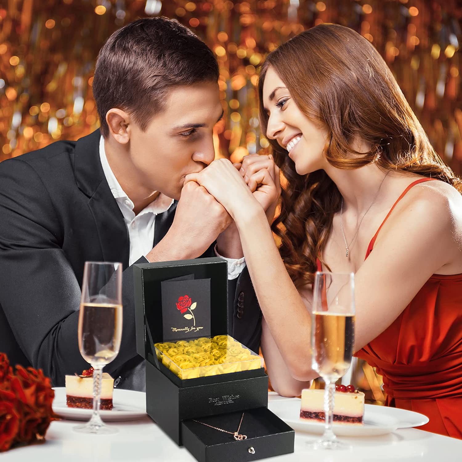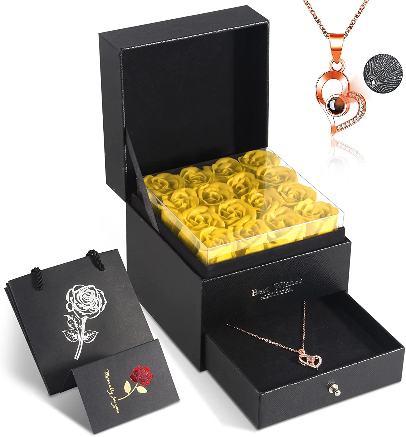 - Luxury 5-in-1 Gift Set & GUARANTEE- 16 Preserved Eternal Rose + 1 Gift Box + 1 Heart Necklace + 1 Gift Bags with Handles + 1 Greeting Card. Surprise your loved ones with this romantic gift to make her/he happy.