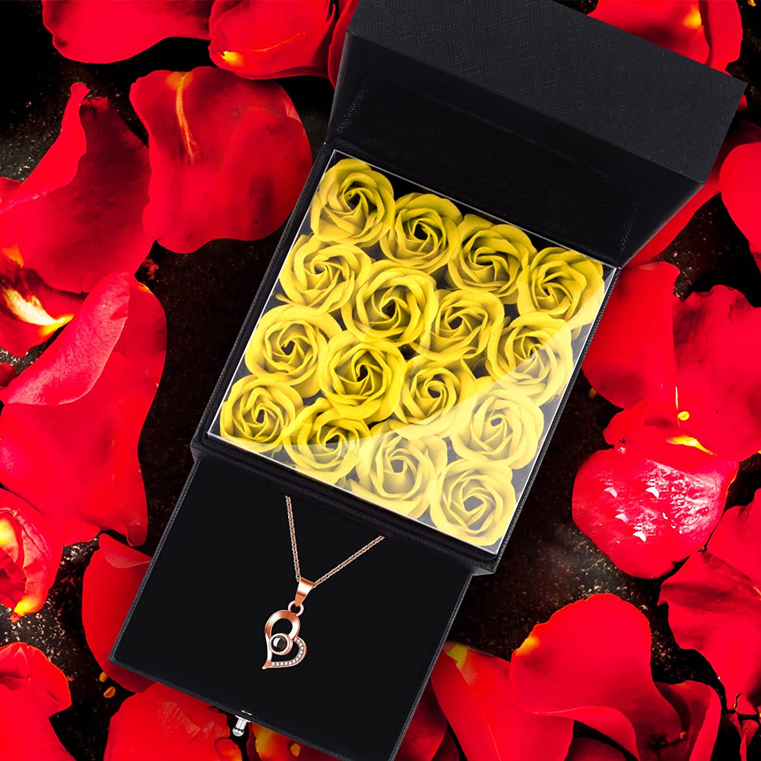 Eternal Preserved Rose, Handmade Soap Rose Flowers Box w/ Love You Necklace 100 Languages, Romantic Gifts for Mom/Wife