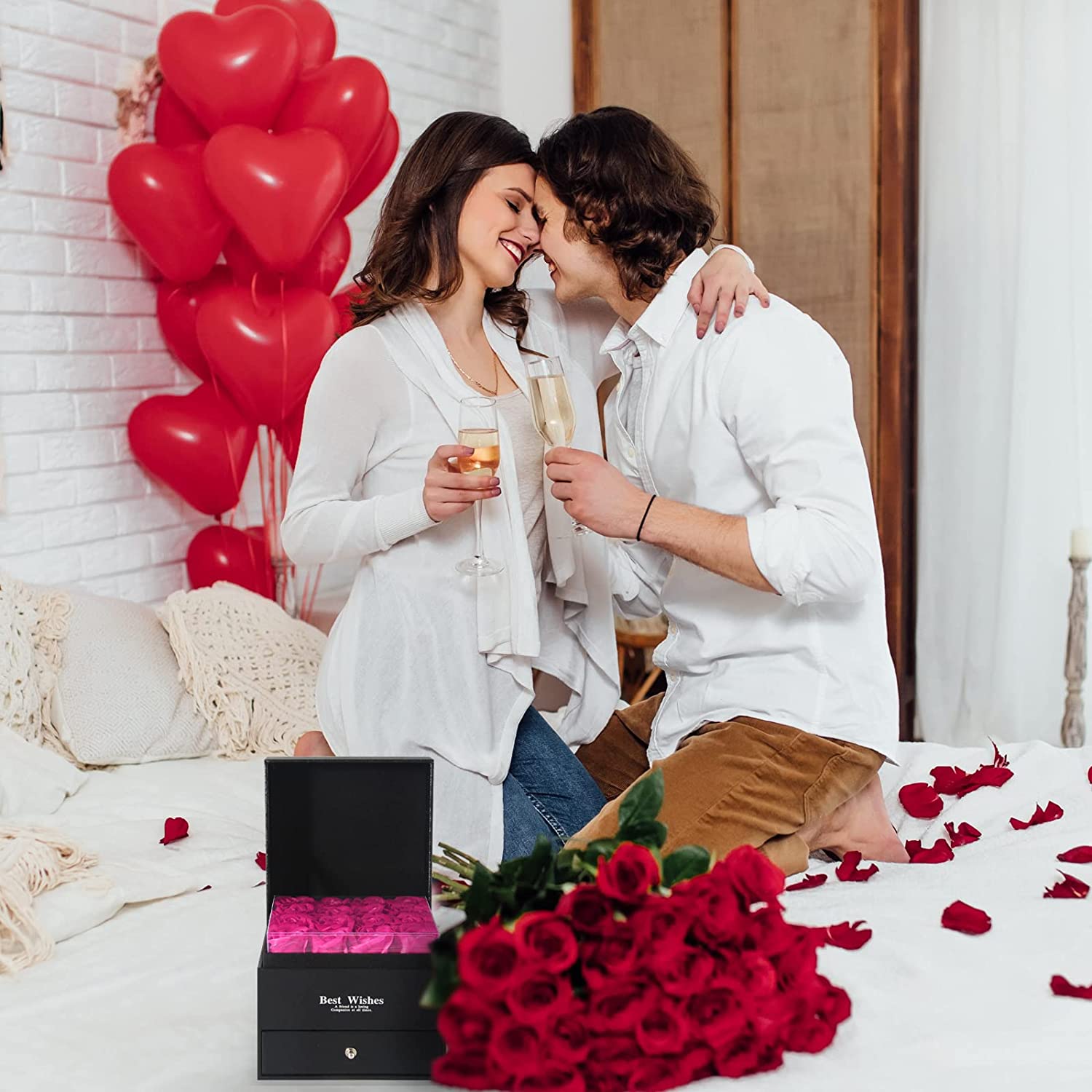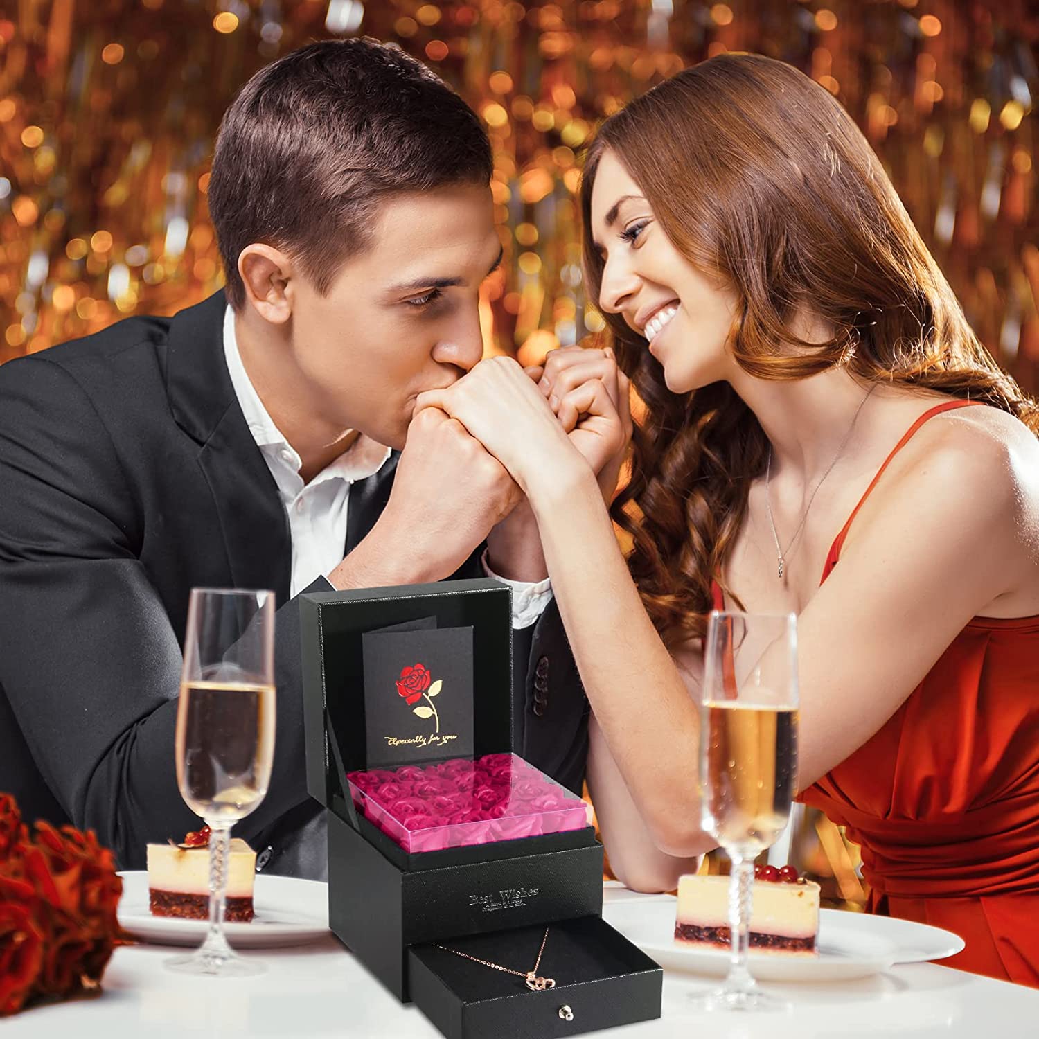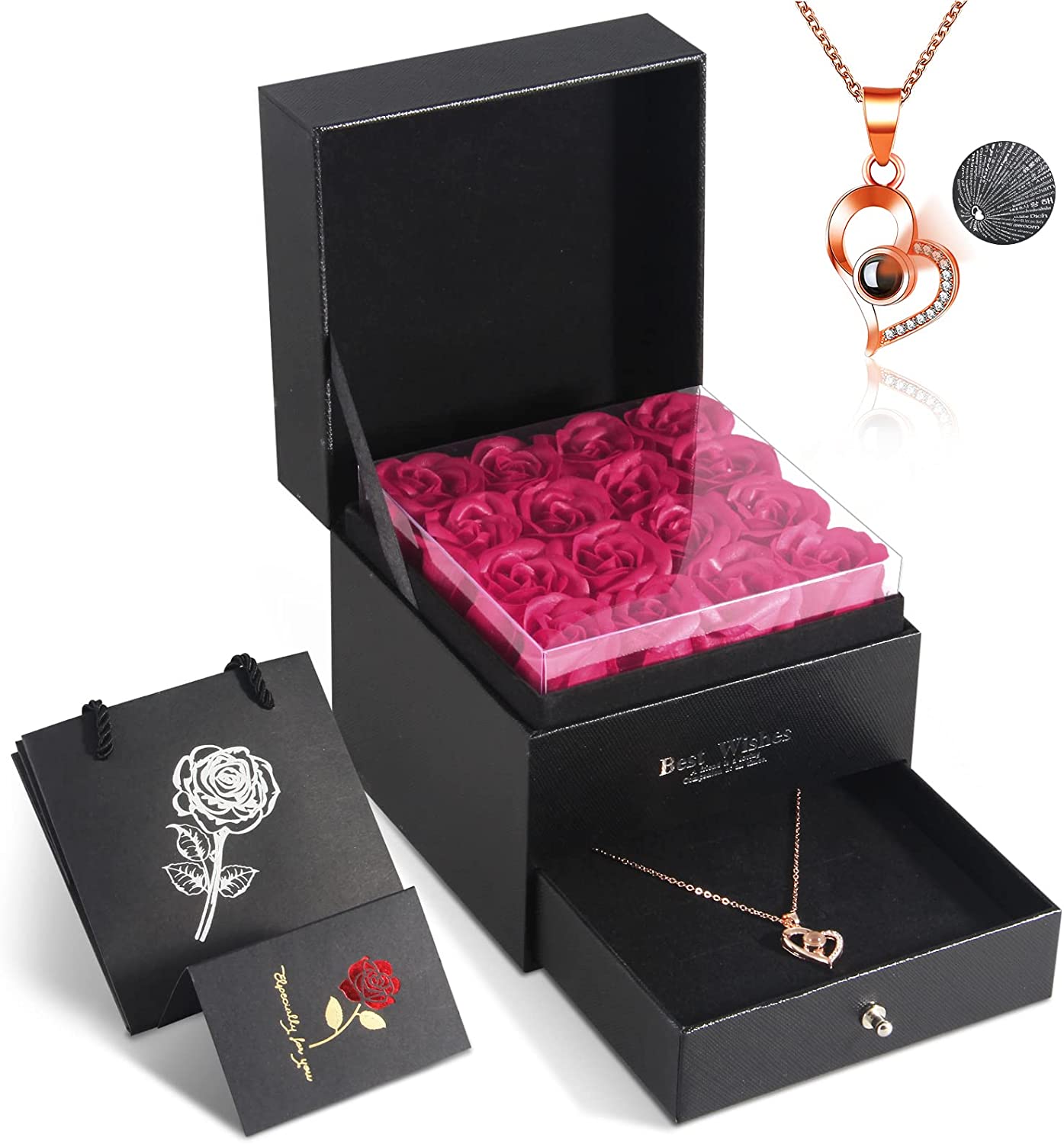 - Luxury 5-in-1 Gift Set & GUARANTEE- 16 Preserved Eternal Rose + 1 Gift Box + 1 Heart Necklace + 1 Gift Bags with Handles + 1 Greeting Card. Surprise your loved ones with this romantic gift to make her/he happy.