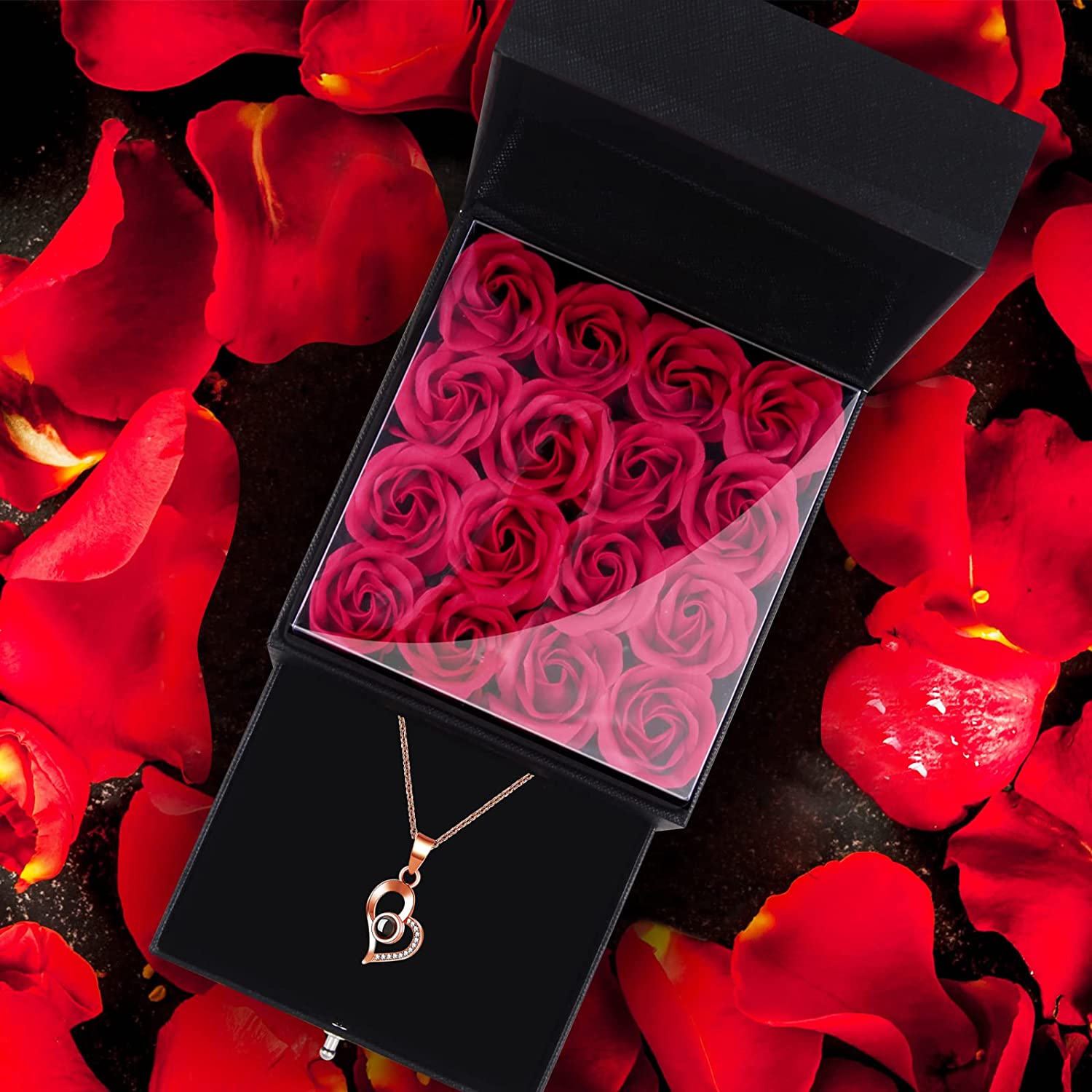 - Unique Gift Box Ideas- Surprise a loved one with the most beautiful gift of all time. Gift box is designed with clamshell and drawer. The box is sturdy and durable. When you open the flip, eternal rose is displayed in an elegant gift box. Open the small drawer at the bottom, there is a necklace inside, the soft sponge cushion inside can protect the jewelry from scratches, also could be used as jewelry box, ring box.