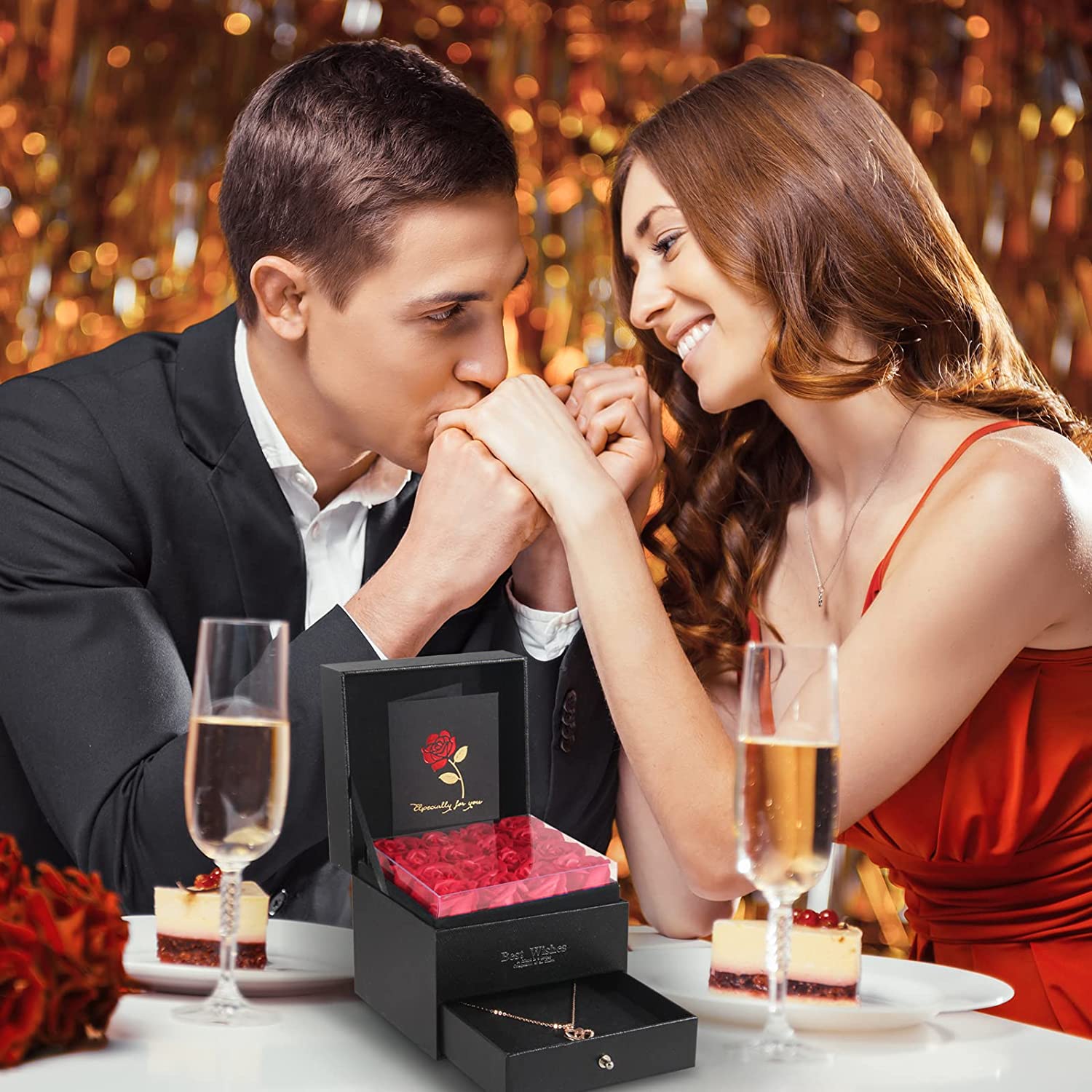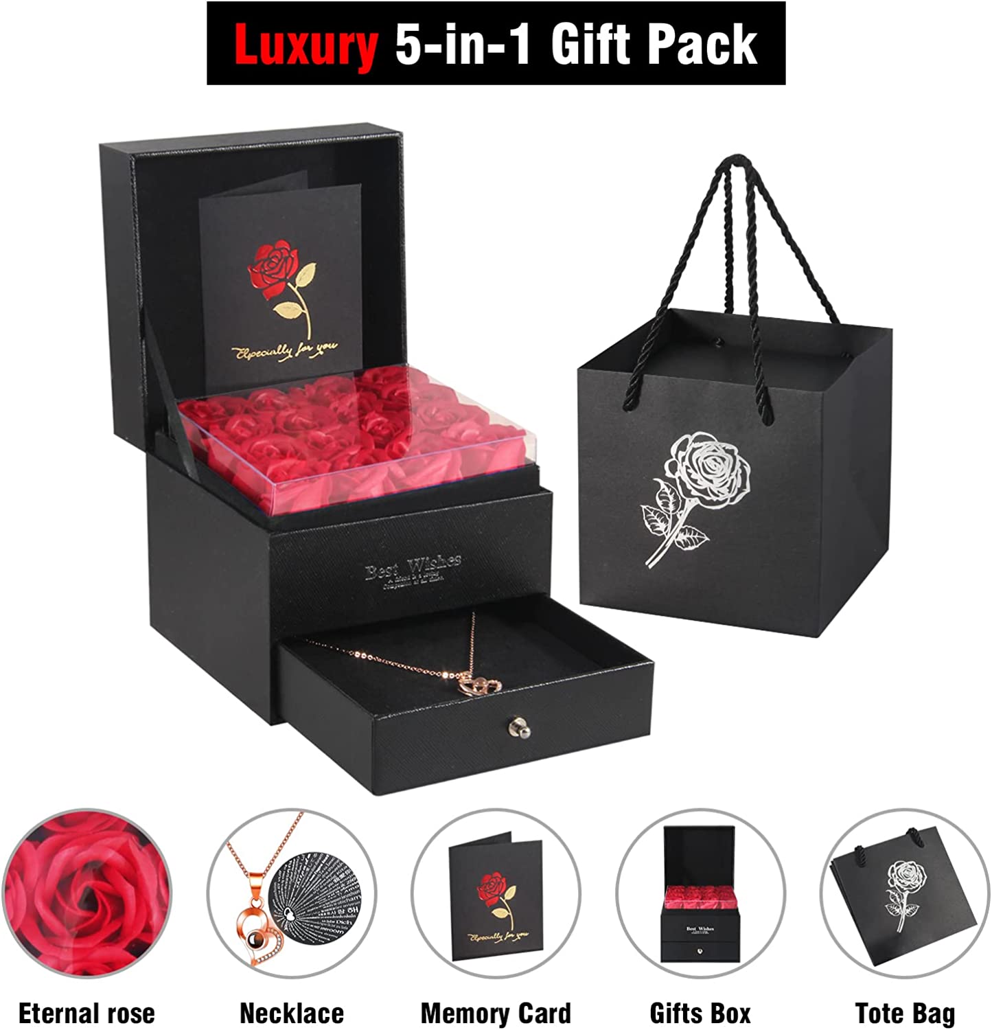 - Unique Gift Box Ideas- Surprise a loved one with the most beautiful gift of all time. Gift box is designed with clamshell and drawer. The box is sturdy and durable. When you open the flip, eternal rose is displayed in an elegant gift box. Open the small drawer at the bottom, there is a necklace inside, the soft sponge cushion inside can protect the jewelry from scratches, also could be used as jewelry box, ring box.