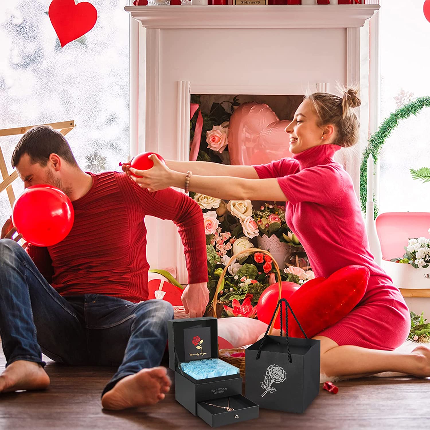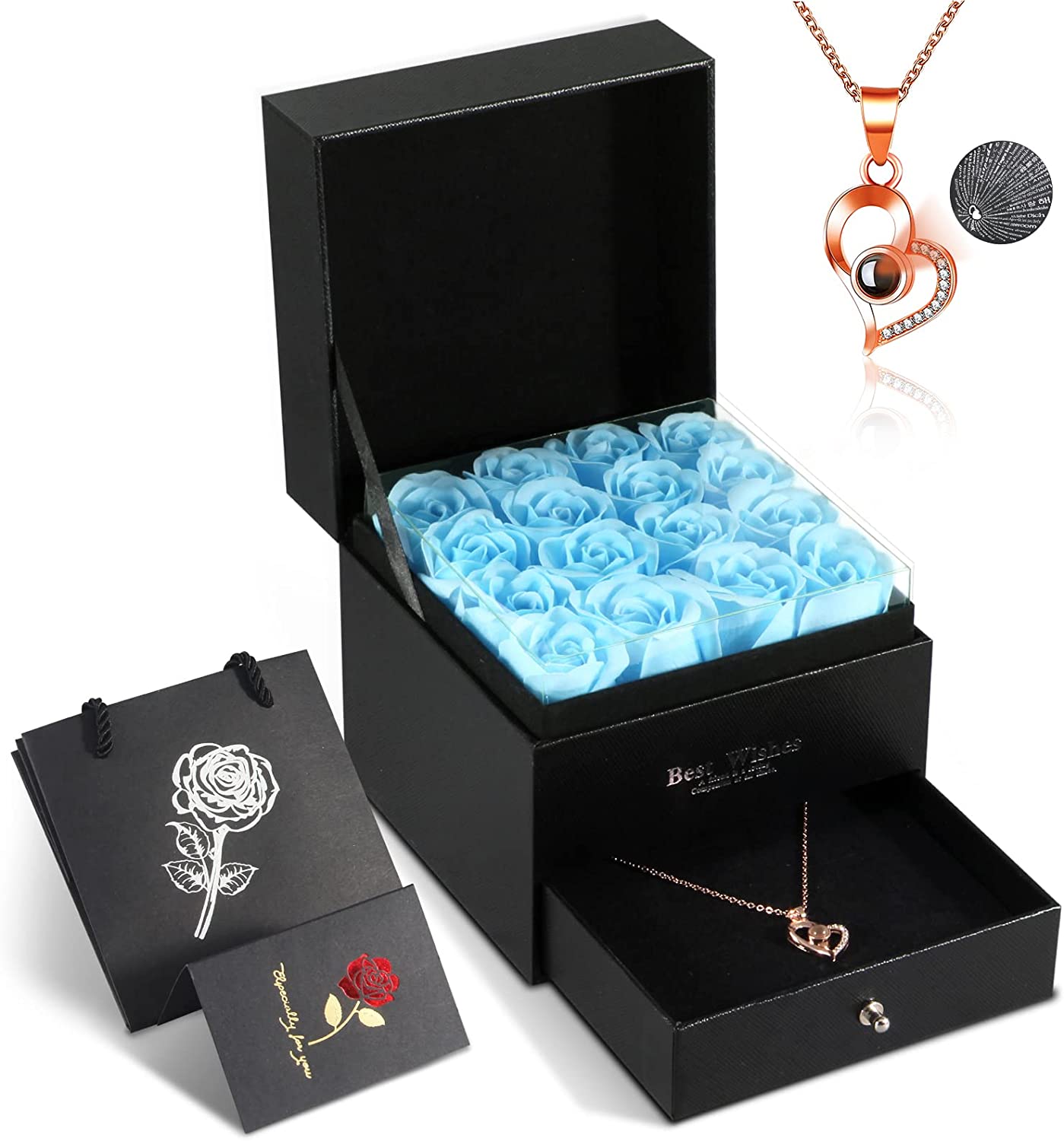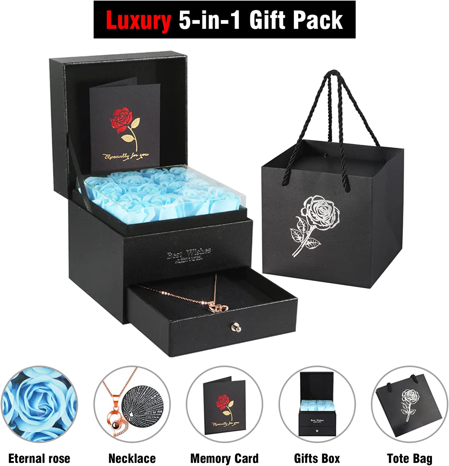 - Unique Gift Box Ideas- Surprise a loved one with the most beautiful gift of all time. Gift box is designed with clamshell and drawer. The box is sturdy and durable. When you open the flip, eternal rose is displayed in an elegant gift box. Open the small drawer at the bottom, there is a necklace inside, the soft sponge cushion inside can protect the jewelry from scratches, also could be used as jewelry box, ring box.