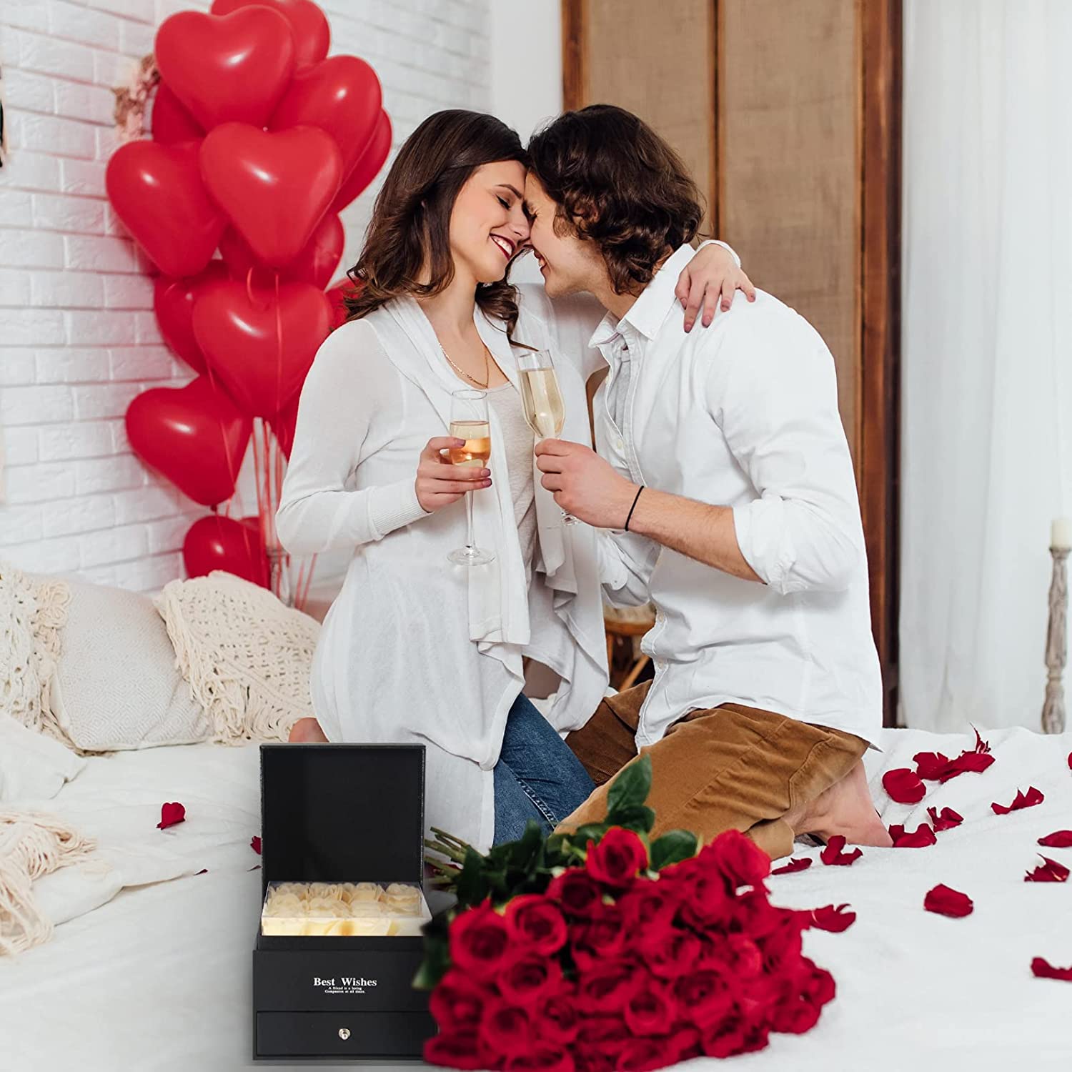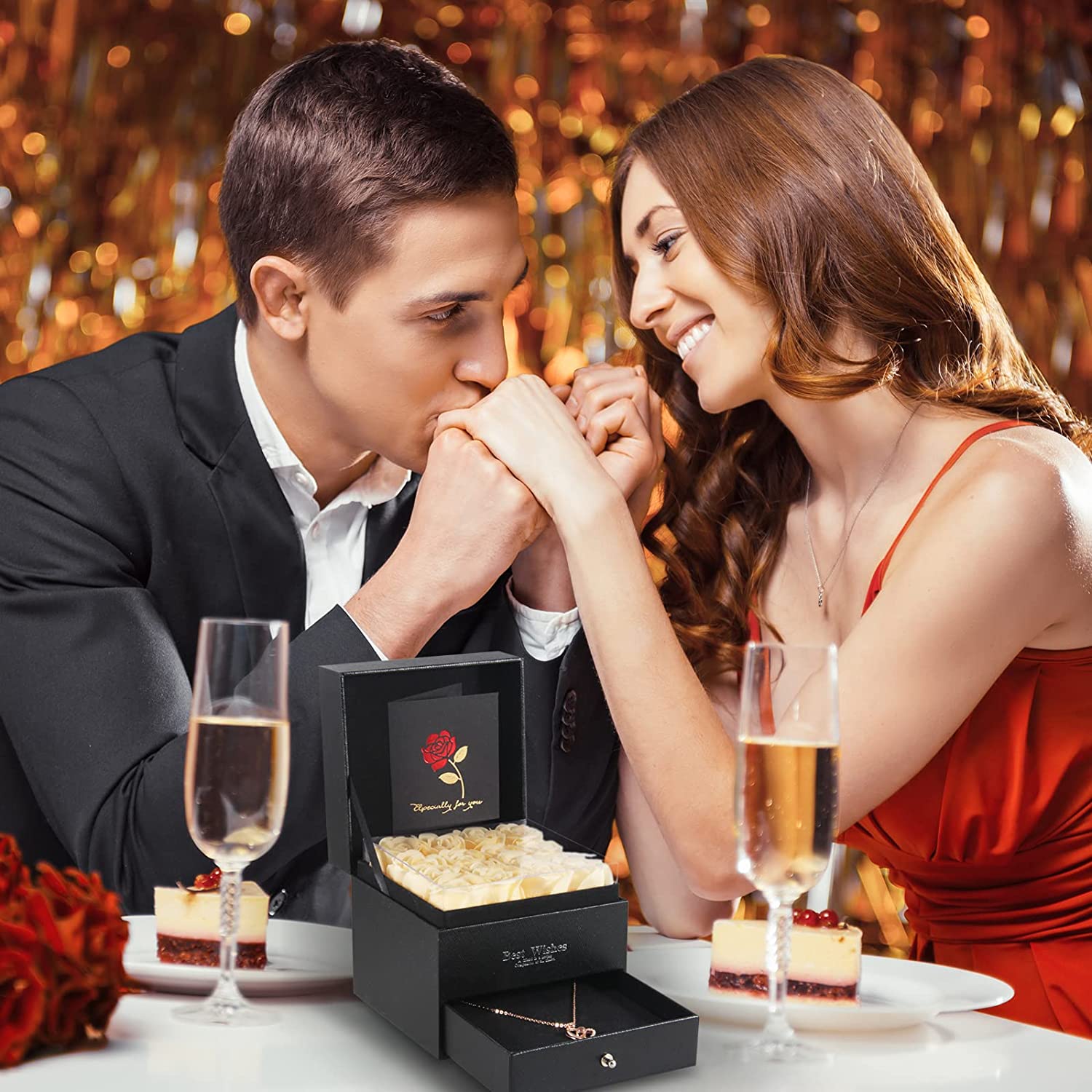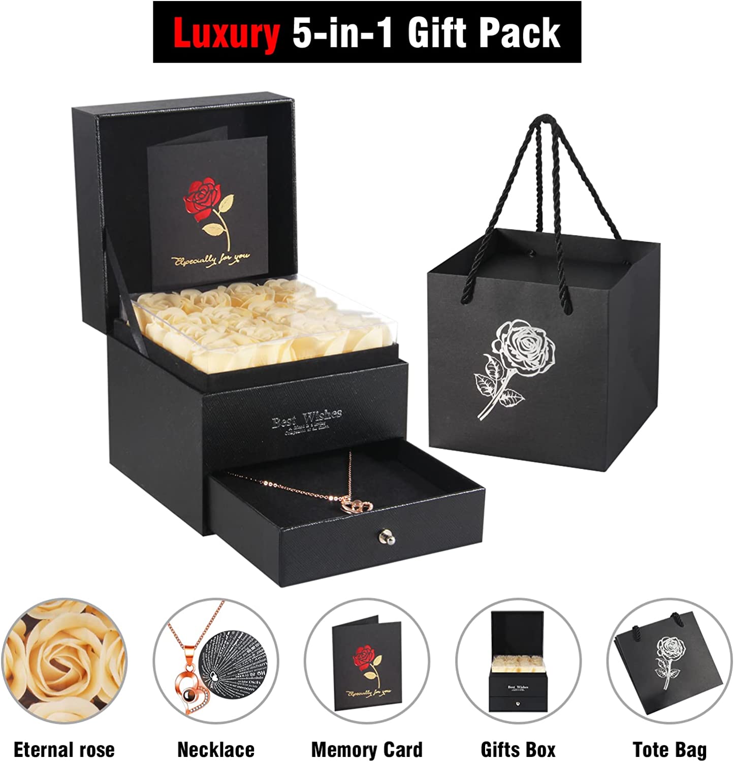 - Unique Gift Box Ideas- Surprise a loved one with the most beautiful gift of all time. Gift box is designed with clamshell and drawer. The box is sturdy and durable. When you open the flip, eternal rose is displayed in an elegant gift box. Open the small drawer at the bottom, there is a necklace inside, the soft sponge cushion inside can protect the jewelry from scratches, also could be used as jewelry box, ring box.