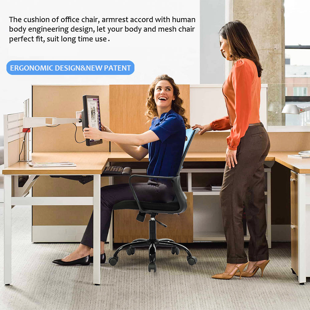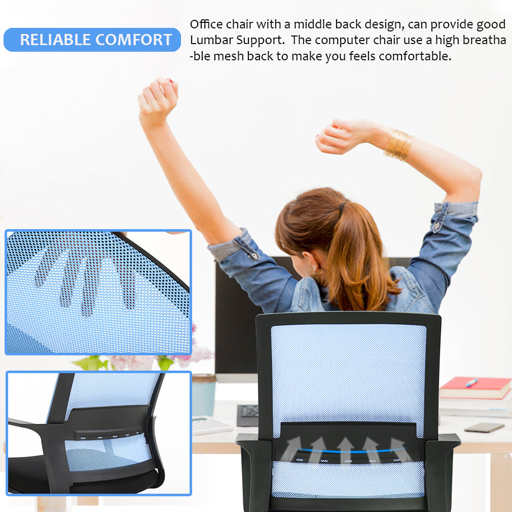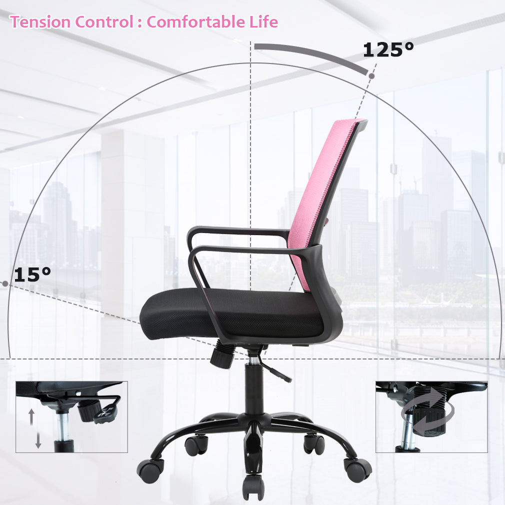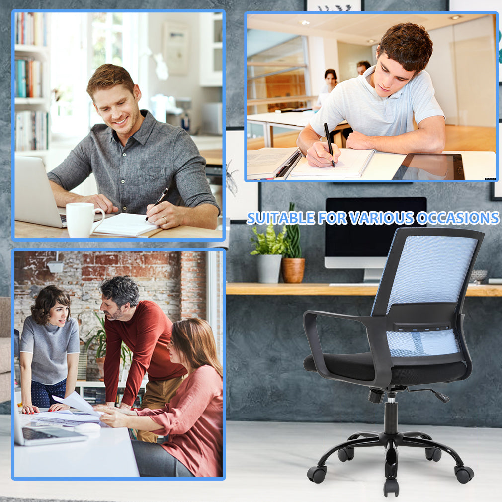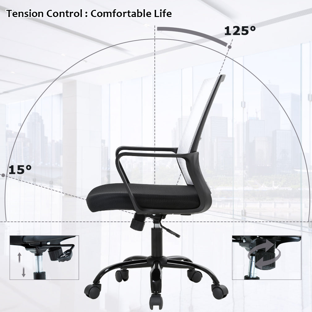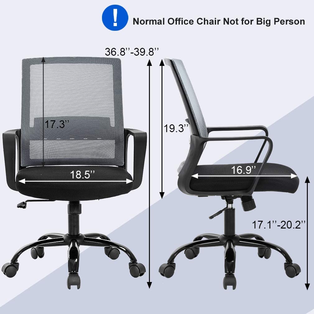 RELIABLE COMFORT: Desk chair using high-density sponge cushion, more flexible, office chair with a middle back design, rectangular ornament not only as a decoration, but it can also provide good Lumbar Support makes you feel comfortable. Office chair desk chair computer chair. EASY TO PUT TOGETHER: Office chair comes with all hardware & necessary tools. Following the desk chair instruction, you'll found easy to set up, and the computer chair estimated assembly time in about 15 mins. Office desk computer chair. SAVE SPACE: It is a good choice to add one of our computer chairs in your office or put a desk chair in your home/activity room. Desk chair office chair computer chair. ERGONOMIC DESIGN & NEW PATENT: The cushion of the office chair, armrest accord with human body engineering design, let your body and mesh chair perfect fit, suit long time use, and new nylon base gives you creative design! Computer chair office chair desk chair. QUALITY ASSURANCE: All the accessories of our office chair have passed the test of BIFMA, which is a guarantee for your personal safety. The mesh chair can bear a weight of 250 lbs. Office chair computer chair desk chair. Our office chair can satisfy all your daily needs. Ergonomically designed with a highly ventilated mesh back, a soft moderate sponge cushion will fit into your sitting position for a long time you won't feel tired. The bottom of the desk chair is equipped with a tension adjusting knob to provide a certain degree of tilt so that you can relax after work. The adjusting lever can help you adjust the height of the seat so that the chair can reach your ideal height. Home Office Chair Ergonomic Cheap Desk Chair Swivel Rolling Computer Chair Executive Lumbar Support Task Mesh Chair Adjustable Stool for Women & men, Black: Feature: *- New office chair style, beautiful generous and strong practicability. *- Size and look make the desk chair save space ideal for any place. *- The computer desk chair with heavy-duty metal base and arms supports, and lock height control. *- 360-degree swivel wheel and chair can be more flexible in working station. *- All accessories are passed BIFMA test.