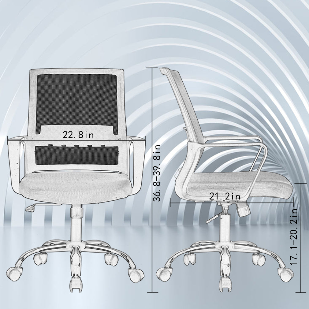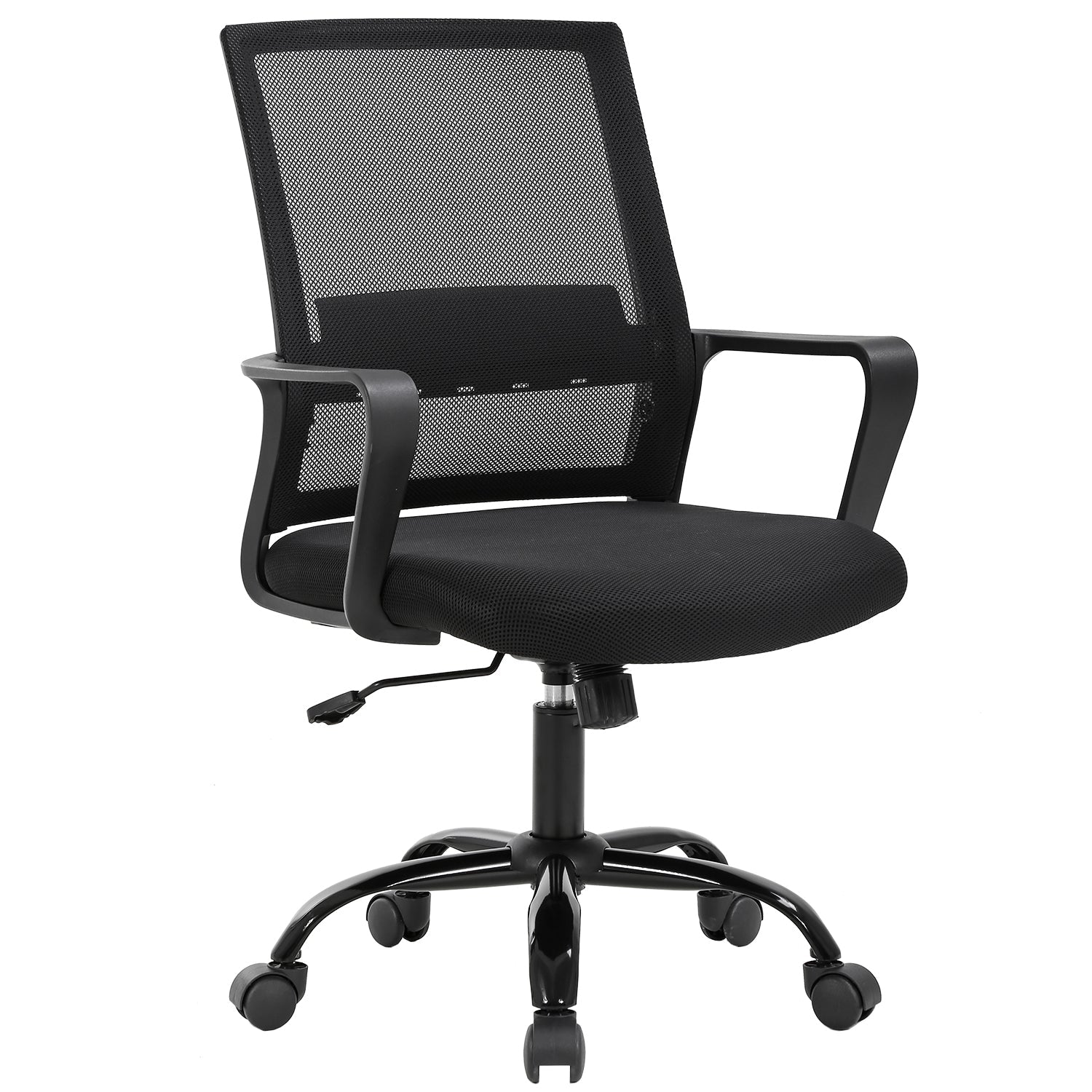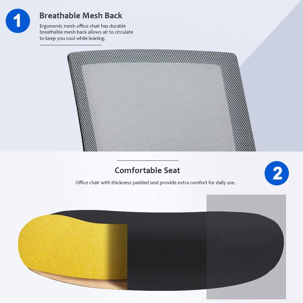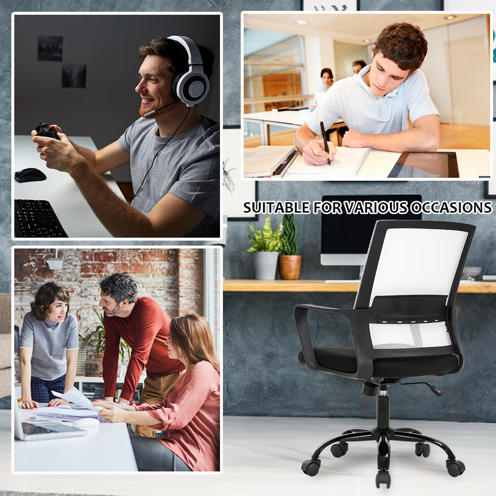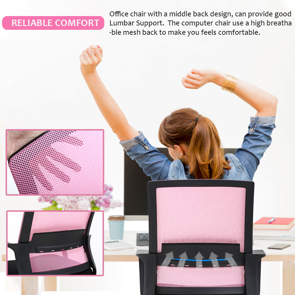 RELIABLE COMFORT: Desk chair using high-density sponge cushion, more flexible, office chair with a middle back design, rectangular ornament not only as a decoration, but it can also provide good Lumbar Support makes you feel comfortable. Office chair desk chair computer chair. EASY TO PUT TOGETHER: Office chair comes with all hardware & necessary tools. Following the desk chair instruction, you'll found easy to set up, and the computer chair estimated assembly time in about 15 mins. Office desk computer chair. SAVE SPACE: It is a good choice to add one of our computer chairs in your office or put a desk chair in your home/activity room. Desk chair office chair computer chair. ERGONOMIC DESIGN & NEW PATENT: The cushion of the office chair, armrest accord with human body engineering design, let your body and mesh chair perfect fit, suit long time use, and new nylon base gives you creative design! Computer chair office chair desk chair. QUALITY ASSURANCE: All the accessories of our office chair have passed the test of BIFMA, which is a guarantee for your personal safety. The mesh chair can bear a weight of 250 lbs. Office chair computer chair desk chair. Our office chair can satisfy all your daily needs. Ergonomically designed with a highly ventilated mesh back, a soft moderate sponge cushion will fit into your sitting position for a long time you won't feel tired. The bottom of the desk chair is equipped with a tension adjusting knob to provide a certain degree of tilt so that you can relax after work. The adjusting lever can help you adjust the height of the seat so that the chair can reach your ideal height. Home Office Chair Ergonomic Cheap Desk Chair Swivel Rolling Computer Chair Executive Lumbar Support Task Mesh Chair Adjustable Stool for Women & men, Black: Feature: *- New office chair style, beautiful generous and strong practicability. *- Size and look make the desk chair save space ideal for any place. *- The computer desk chair with heavy-duty metal base and arms supports, and lock height control. *- 360-degree swivel wheel and chair can be more flexible in working station. *- All accessories are passed BIFMA test.