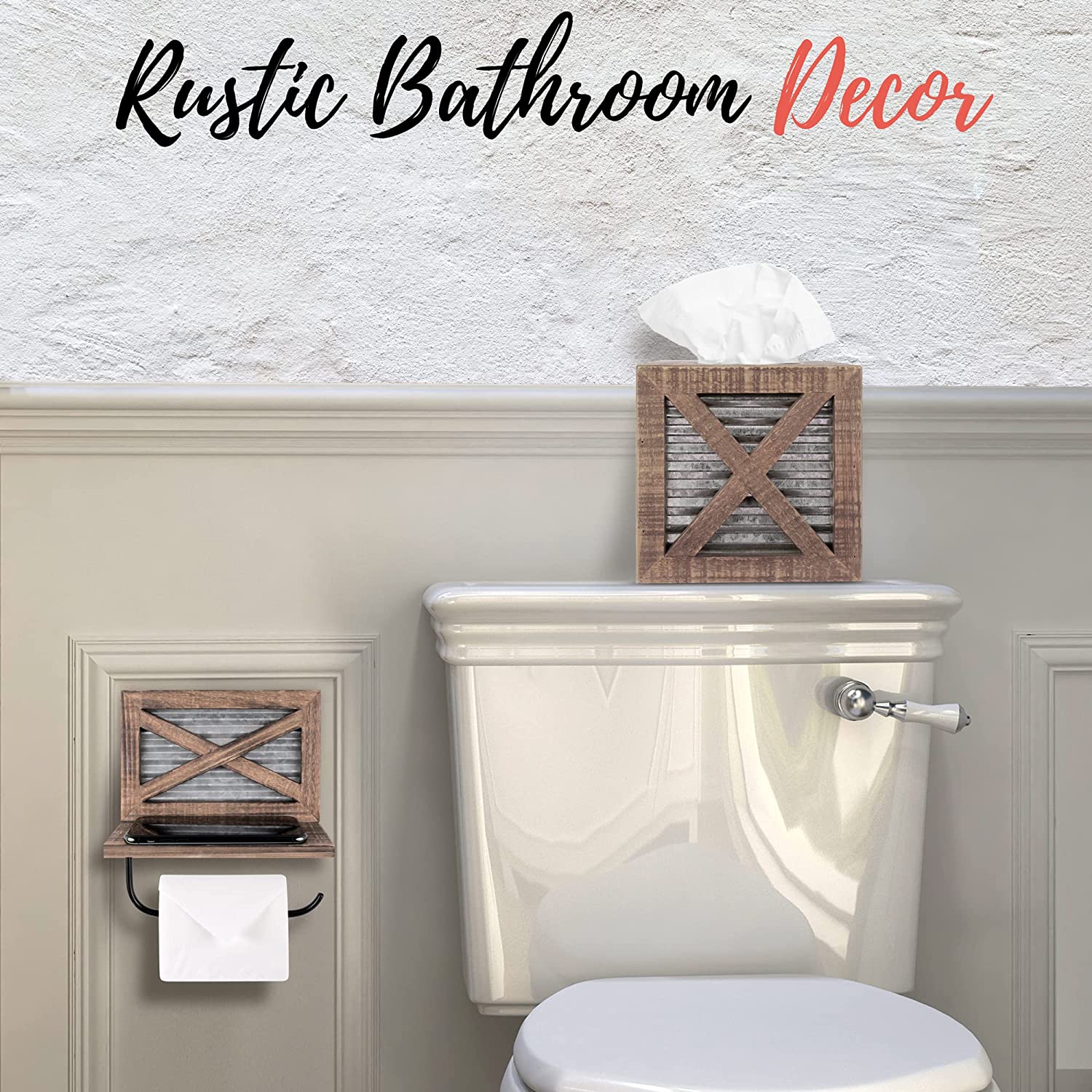 - Farmhouse Bathroom Decor Rustic Toilet Paper Holder - A chic industrial toilet paper holder is made from weathered solid wood and corrugated galvanized metal, adding a rustic decor touch to any bathroom wall and bringing life to your bathroom decor farmhouse style