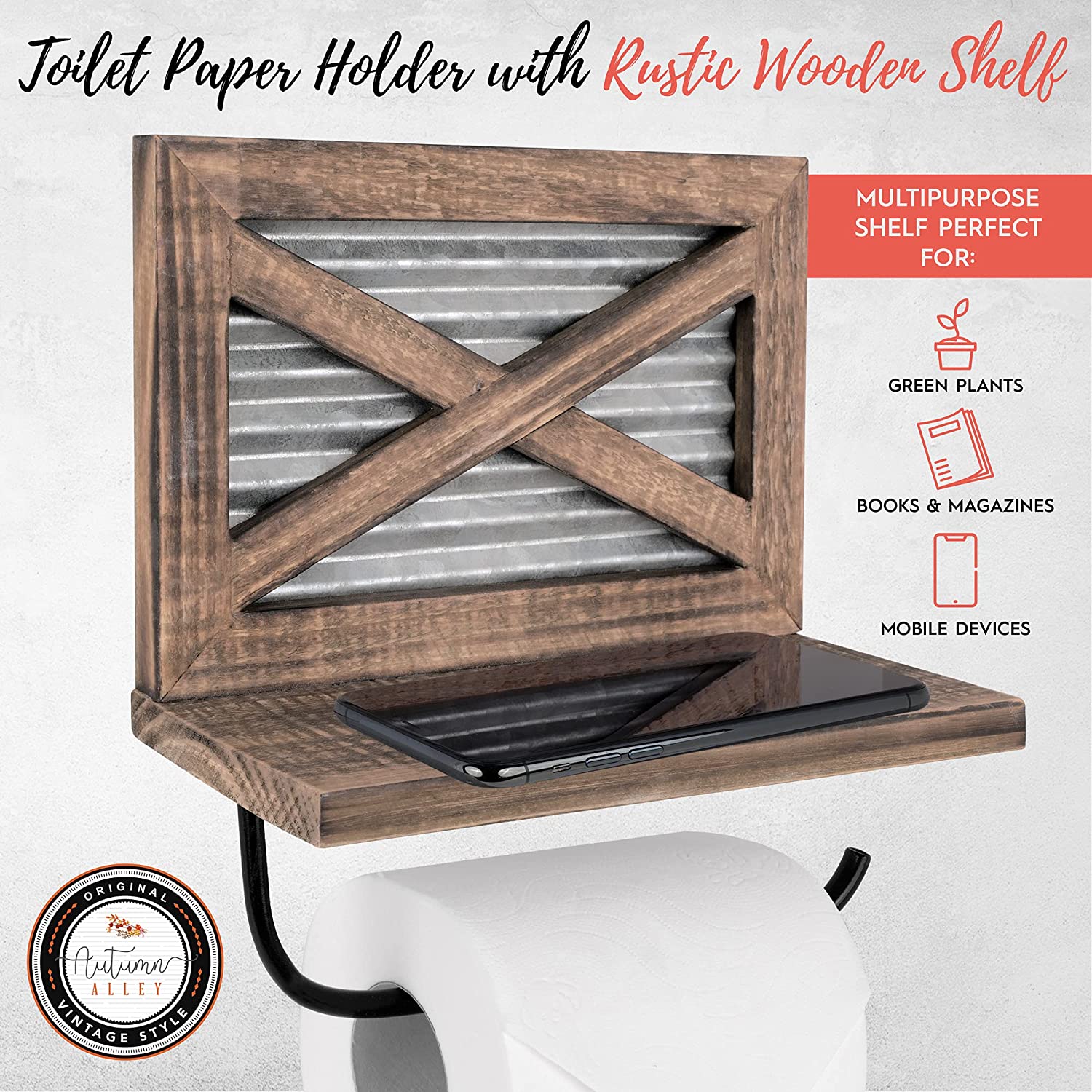 - Functional and Decorative - A wall-mounted rustic toilet paper holder with shelf is the perfect size to hold a large roll of toilet paper while also keeping toiletries, or other home and western bathroom decor you desire, and it will add a rustic country style to any bathroom