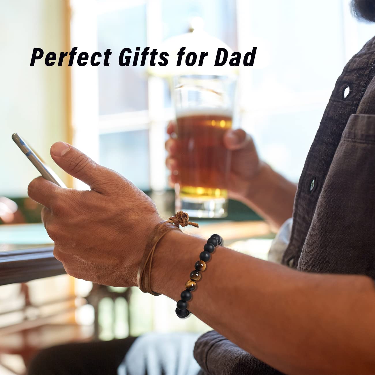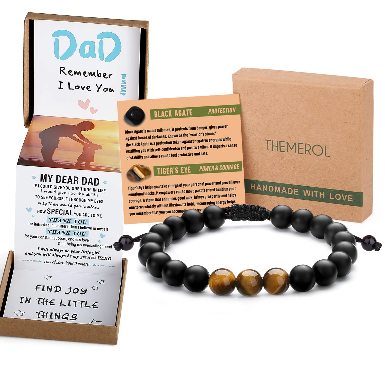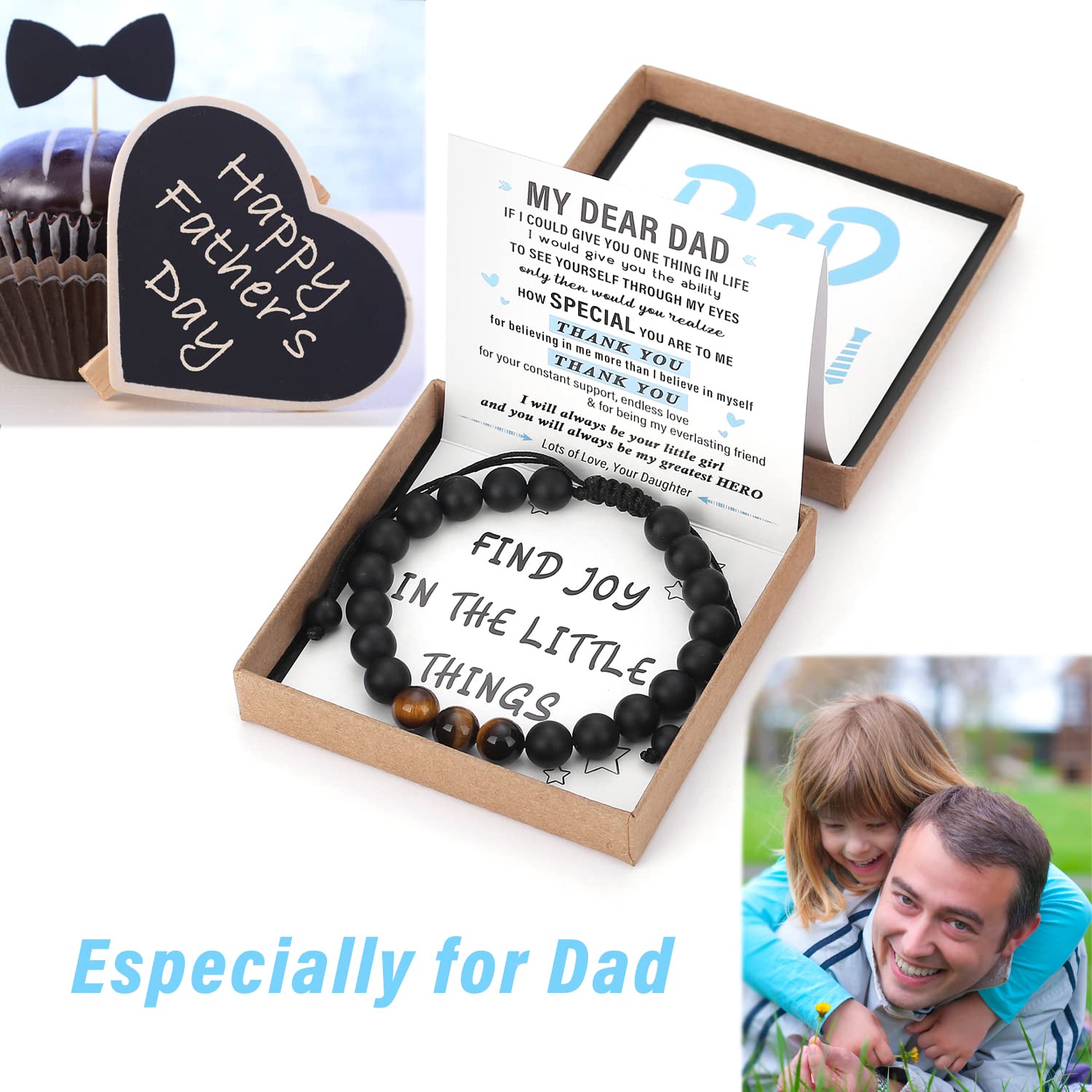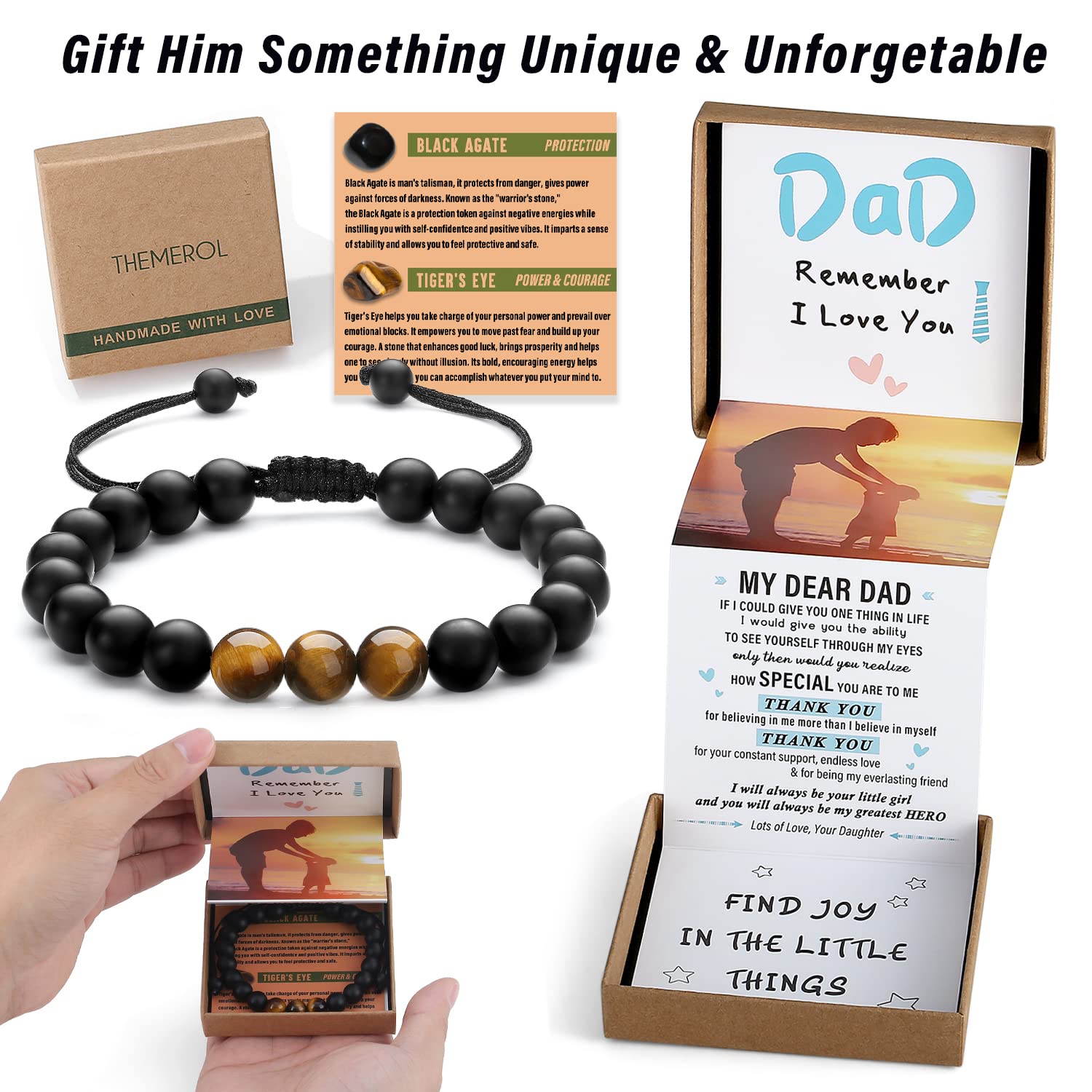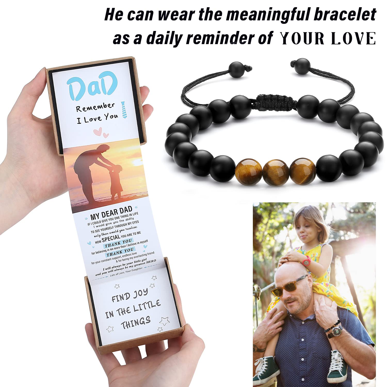 - 【Unique and Especially for Dad】This Natural Crystal Bracelet is made of powerful Tiger's Eye and protective Black Agate. It brings your dad powerful strength, courage, good luck and prosperity, and imparts a sense of stability and allows him to feel protective and safe. The special pull out gift box is super cute, sweet image and the sentimental text that especially for your dad is a great touch. It works amazing as gifts for dad, Fathers Day gifts from daughter, birthday gifts for dad.