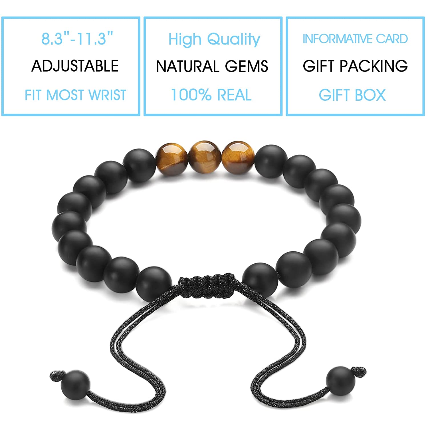 - 【Thoughtful Dad Gifts that He Can Wear Daily】The cool bracelet for men and the super cute pull out card with sweet message and image will put a big smile on your dad's face. The Tiger eye bracelet for men can be adjusted into 8.3"-11.3", it fits well, nice and tight for most wrist sizes for men. Just pull the rope at the end to adjust the length as you needed, it's convenient, elegant and very easy to put on and take off. He can wear the great bracelet as a reminder of your love everyday.