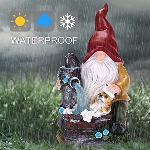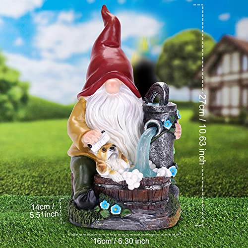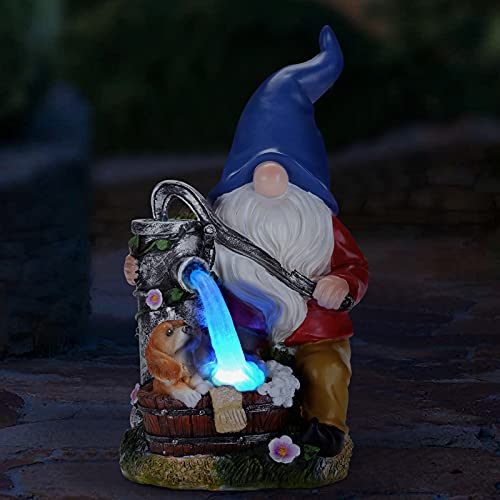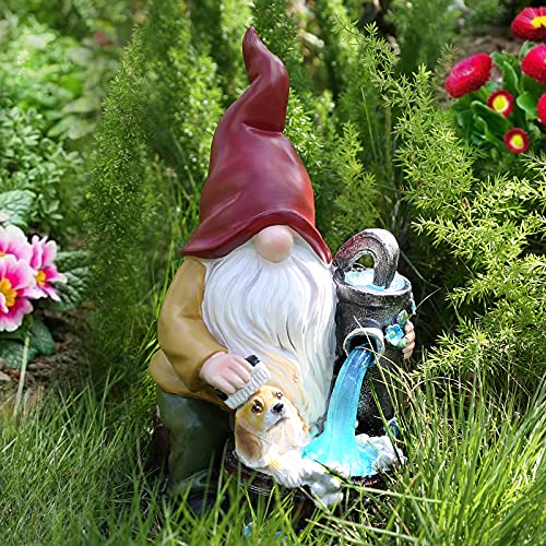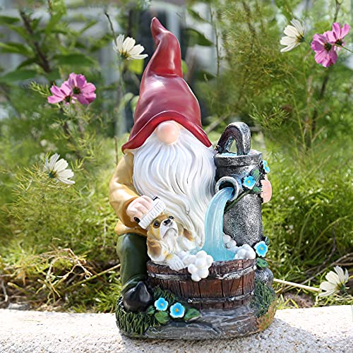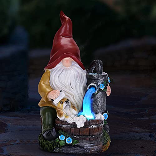- GNOMES GARDEN KIT: From garden sculptures, an adorable garden gnome is pumping water into a barrel to bathe his dog, includes details like soap bubbles, brush/towel, flowers, etc. At dusk, the water will automatically glow with blue light. Place it where you want it to, and it will keep working for you every day.