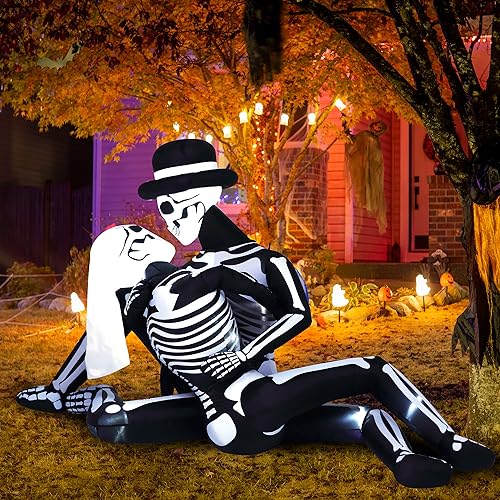 - Spine-Chilling Romance: Elevate your Halloween setup with our 8.5 feet cuddling skeletons, locked together in an eternal embrace. The Halloween inflatable skeleton couple is going to be the center of your Halloween outdoor decorations, sending shivers down the spine of everyone passing by. This scary masterpiece will definitely make a unique addition to your spooky décor.