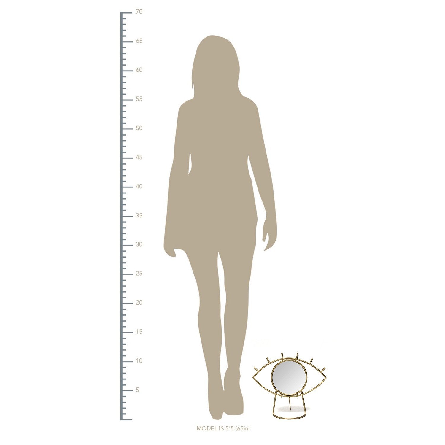 Home Decor Gold Eye Tabletop Mirror Handcrafted of 90% metal, 10% mirror glass Gold Mirror Measures 6.25" diameter Product Measurement 14.00"W X 6.00"D X 11.50"H Collapsible frame for easy storage Wipe clean with a soft cloth Imported