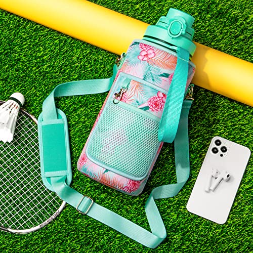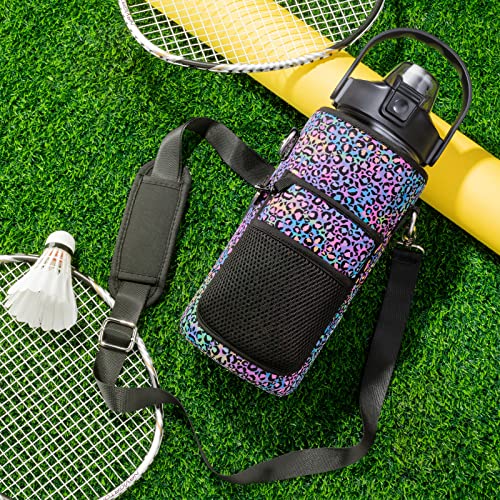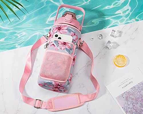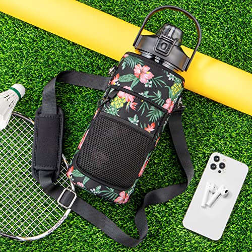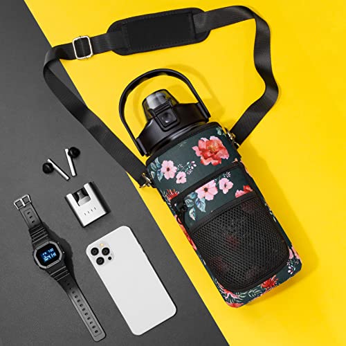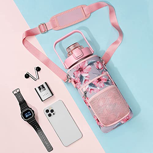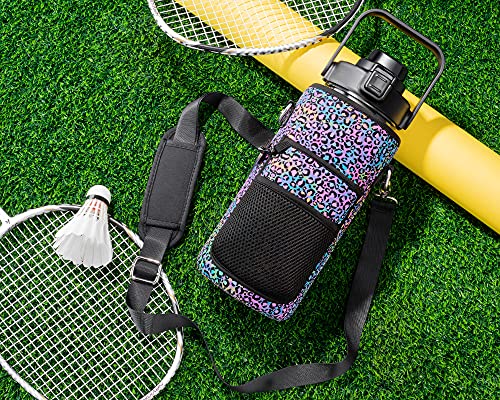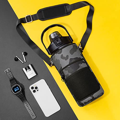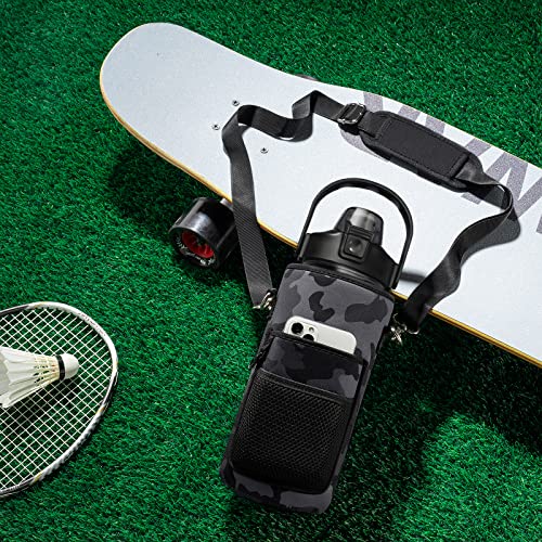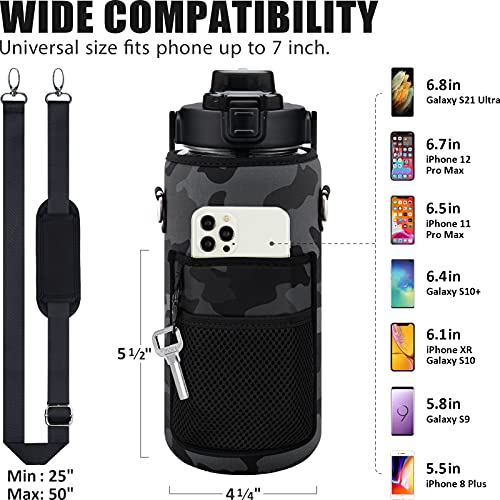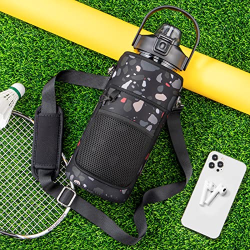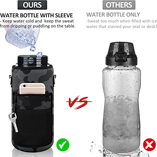 - MULTIFUCTION INSULATED STORAGE SLEEVE FOR WATER BOTTLE: Our 64 oz water jug with straw is designed with high quality 5mm Neoprene sleeve to protect water bottle from slight bumps, but keep water cold longer & absorb messy sweat to avoid dripping on the table or seat. 2 pockets on the sport water jug sleeve can be storage phone, card, airpods, key etc. Easy to carry to gym, sport. You’ll release your hand with comfortable padded shoulder strap & adjust from 25" to 50" to ensure a snug fit.