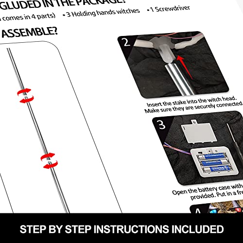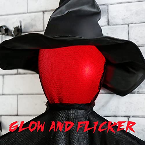 - Faceless heads glow and flicker. Witch screams with sound-activated sensor.