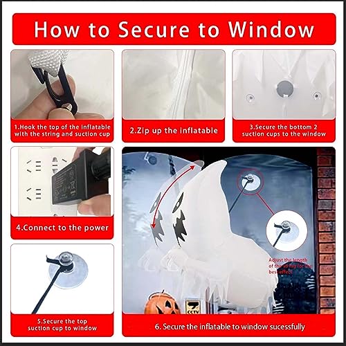 - 【Easy to Set Up】: Secure the bottom suction cups to the window, then zip up and connect to the power, the built-in powerful blower will inflate the Halloween outdoor yard decoration quickly and automatically within seconds. This Halloween inflatable Ghost will quickly become the focal point of your patio or lawn, drawing the attention of kids and guests. (Pls clean the window and get the suction cups wet before pressing them to the window for more stable)