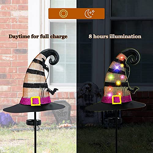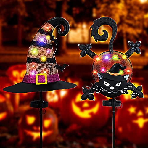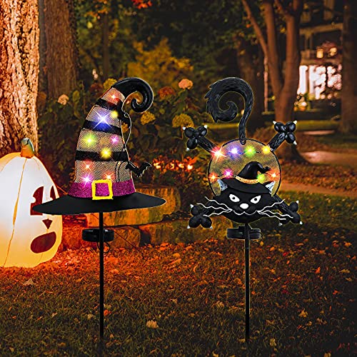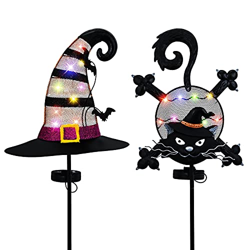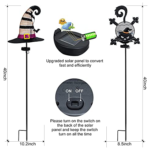 - 🎃【Whimsical Halloween Yard Decoration】The SOLAR garden stake Decoration with black cat and witch hat is make of durable metal, waterproof, with long lasting anti-rust paint. Cute and delicate design with changing flashing LED light, it's beautiful and stunning in the night.