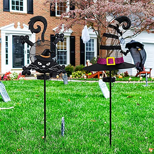 - 🎃【Unique Halloween Design】This cool new metal black cat and witch hat Ground Stake is sure to add a frightful and imposing touch to your front lawn's spooky Halloween decor this year. Delight your neighborhood trick-or-treaters with this stack of 2 set stakes.