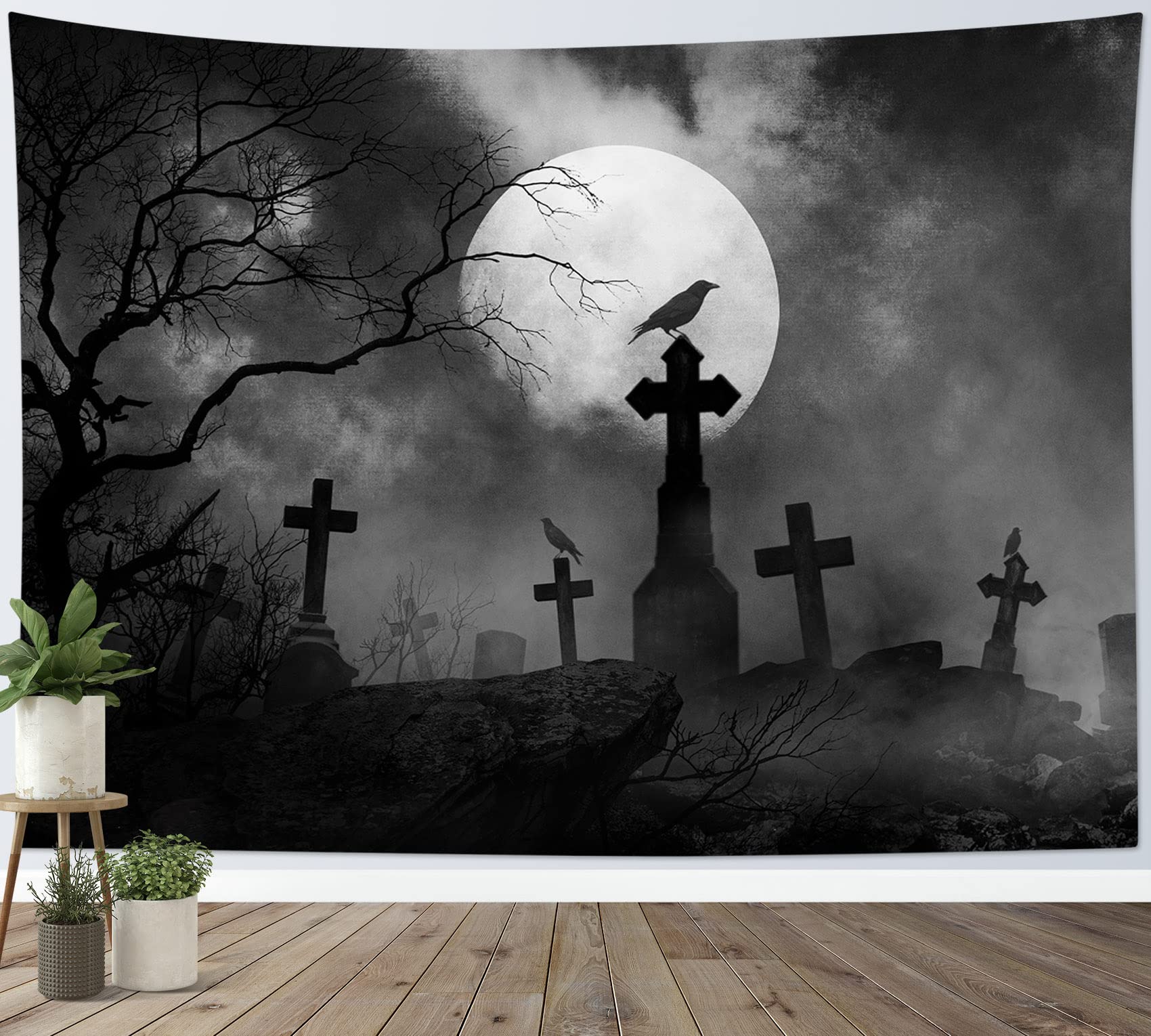 Halloween Tapestry Full Moon Black Crow Tombstone Dead Tree , Scary Grey Cemetery Forest Wall