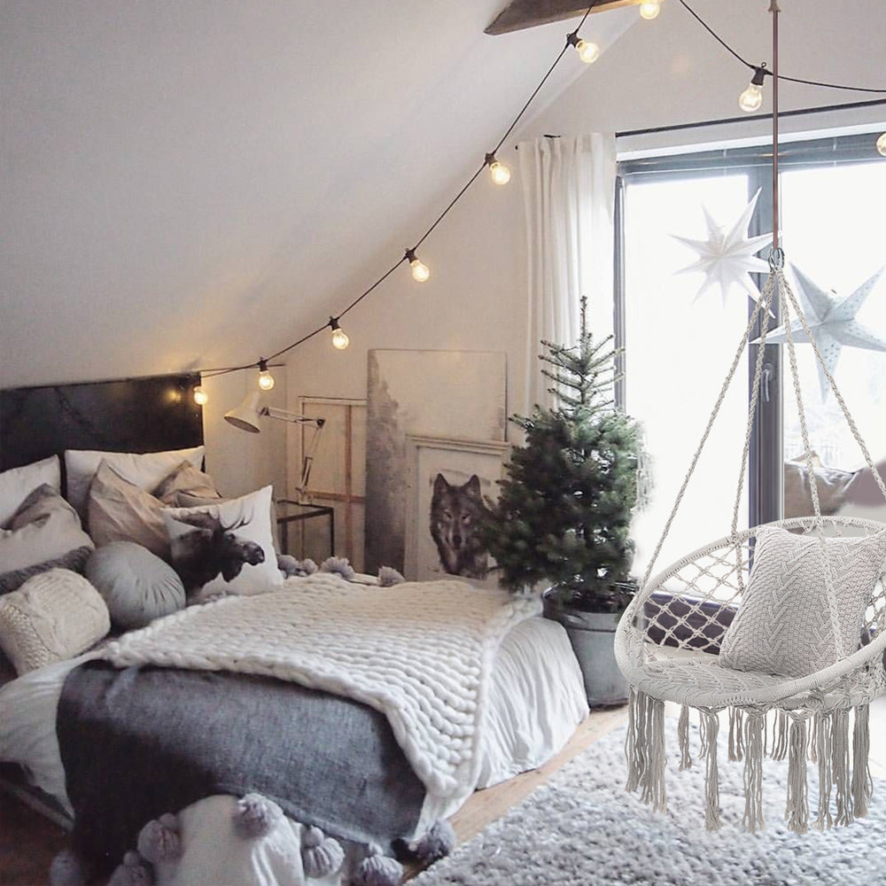 Hammock Chair Macrame Swing, Handmade Knitted Hanging Cotton Rope Chair for Home Patio Deck Yard Garden Reading Leisure The Hammock Chair Macrame is perfectly used for your home, patio, or garden. The beautiful chair provides you with a quiet, comfortable and cozy place, and is the best partner for the rest time. When you are ready to relax and unwind, hang it from any sturdy overhang to create your own relaxing space, enjoy nature, rest under the sunset, relax poolside, or lounge on the deck. Great for any season, you'll be swinging in style from almost any location. The hanging chair is best gift to your children, families and friends for Christmas. Specifications: *- Material: Cotton rope, Iron hoop *- Maximum user weight: 150kg (330 pounds) *- Small Circuit diameter: 60cm/23.6" *- Big Circuit diameter: 80cm/31.5" *- Height: 120cm/47.2" Package Includes: 1 x Hammock Chair Please note that NO hanging chain, hooks or pillow with the item before purchase. Notice: *- Please allow 1~3 cm error due to manual measurement. Please make sure you do not mind before you bid. *- The color may have different as the difference display, please understand. *- No stand or other hardware. No Cushions or pillows. Two Hanging Way *- Swing style(Recommended) -- You can use it as a comfy swing which allows you to sway forth and back. In this case, you will need two anchor points in your ceiling indoors or a single sturdy tree branch in your backyard. *- Pivot style -- Hanging your hammock chair Pivot style allows you to rotate 360 degrees and drift smoothly while you relax. If you prefer this hanging style, you will need only one anchor point. This hanging technique being suspended from the one anchor point with a chain or rope. Warm Tips Check the rope at both ends regularly to prevent excessive wear. It is forbidden to swing back and forth so as to avoid unnecessary damage caused by quick grinding of the two ends. Please pay attention to personal safety during leisure and entertainment. *- HAMMOCK CHAIR MACRAME SWING *- PORTABLE & EASY TO HANG *- Sturdy and Stylish Design *- Comfortable and Relaxing