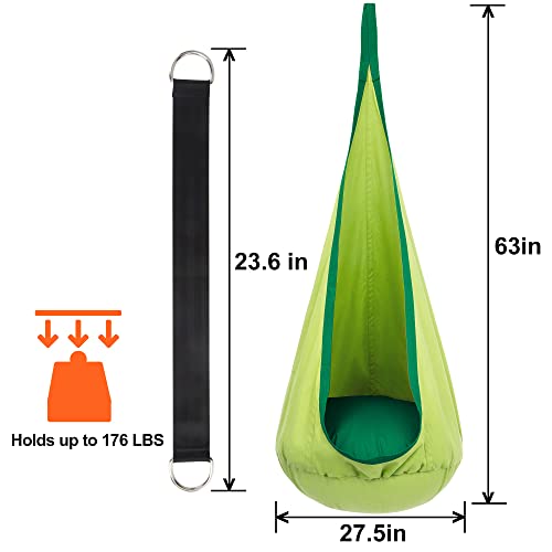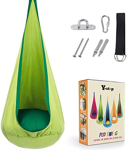 - Easy to Install, the indoor swing included accessories, pod swing, inflatable pillow, rope, ceiling bracket, snap hook, screws (for concrete and wood wall), complete parts make it easier for you to operate. This hanging chair is specially designed for children. In order to enhance the service life, it is recommended that teenagers over 15 years old do not use it for a long time.