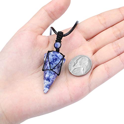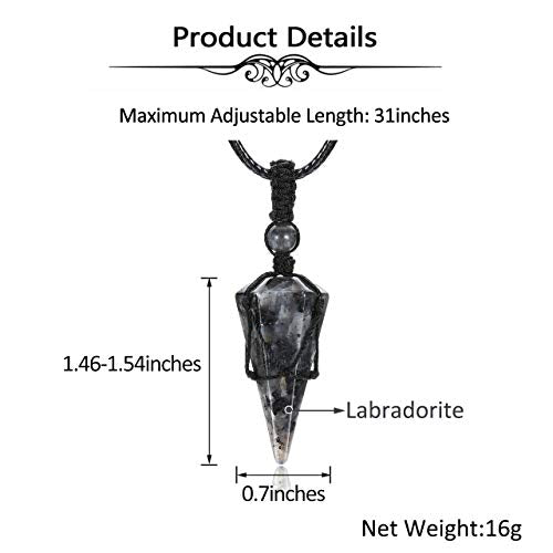 - Each crystal stone of this pendant is carefully selected and polished to set off your beautiful temperament. The pointed crystal stone is 37-39mm in length and 18mm in width. The braided rope is 31" adjustable and 2mm in thickness.