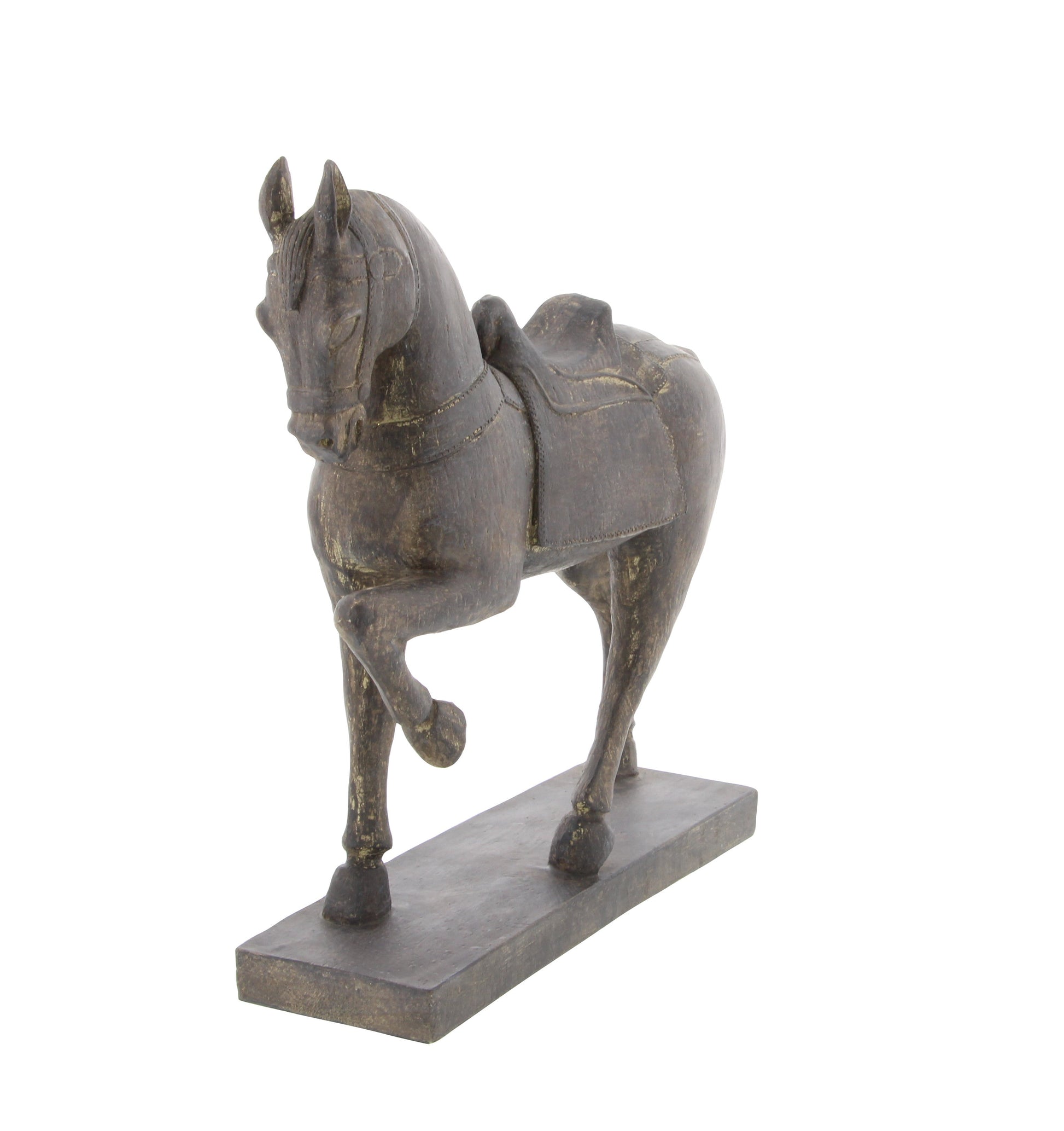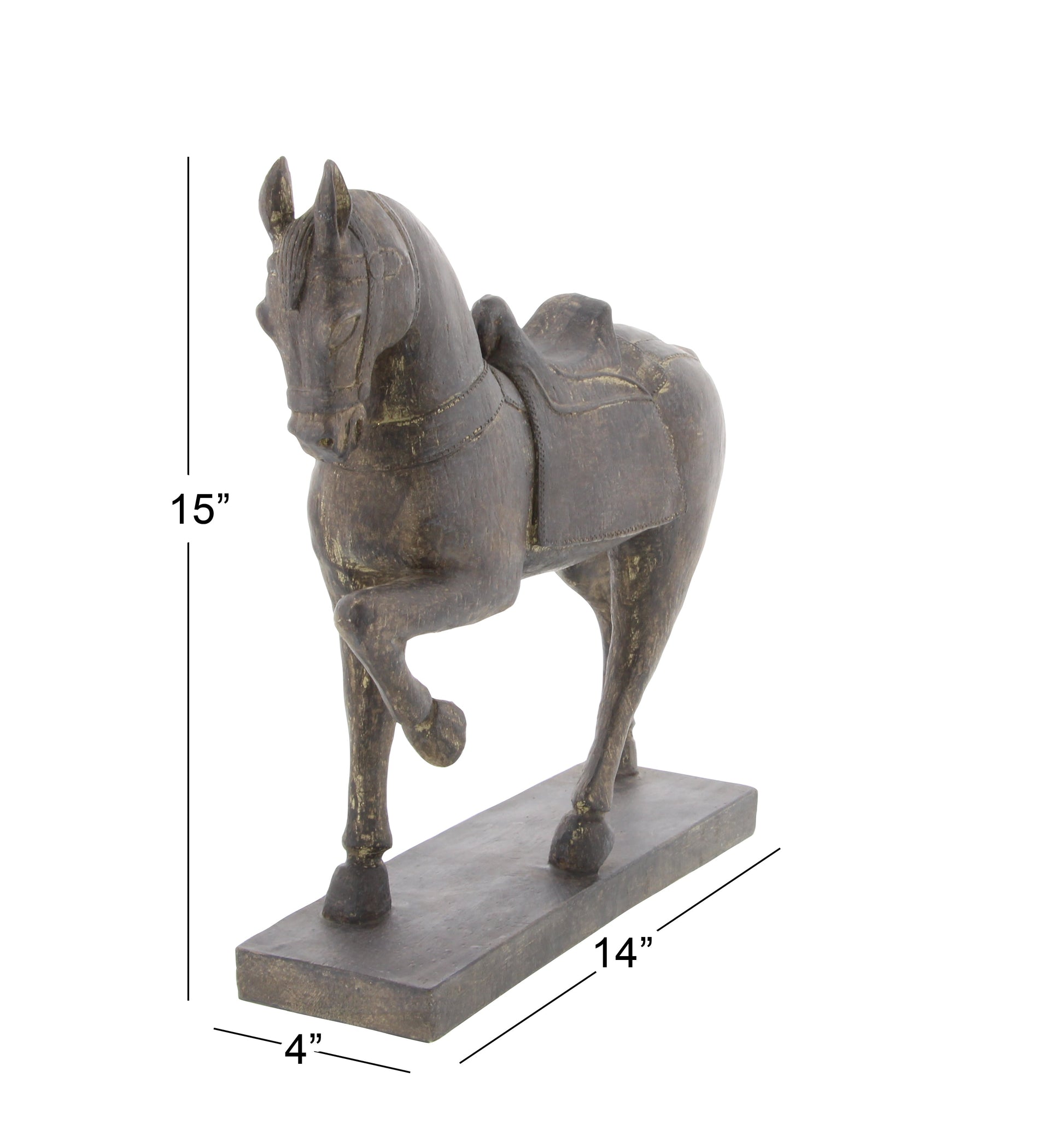 With its stunning features, this sculpture is great to display on any accent table, mantel, or countertop in a traditional-themed hallway, living room, or bedroom. Adorn your surface space by incorporating sculpture into your decor to add depth and texture in your home. A horse shaped on a rectangular base. Designed with black rubber stoppers at the base that prevent scratching furniture and table tops, as well as sliding around. This item is shipped in one carton. Adorn your surface space by incorporating sculpture into your decor to add depth and texture in your home. Suitable for indoor use only. Traditional theme. DecMode 9"H, 9"W Polystone Traditional Horse Sculpture, Brown *- A traditional inspired designed for classic harmony full of friendly charm *- Features a mottled polystone sculpture *- Brown finish adds a soft touch to your space *- Designed with detailed standing horse with raised leg and saddle detail *- Item measures 9”L x 3”W x 9”H and weighs 1.41 lb