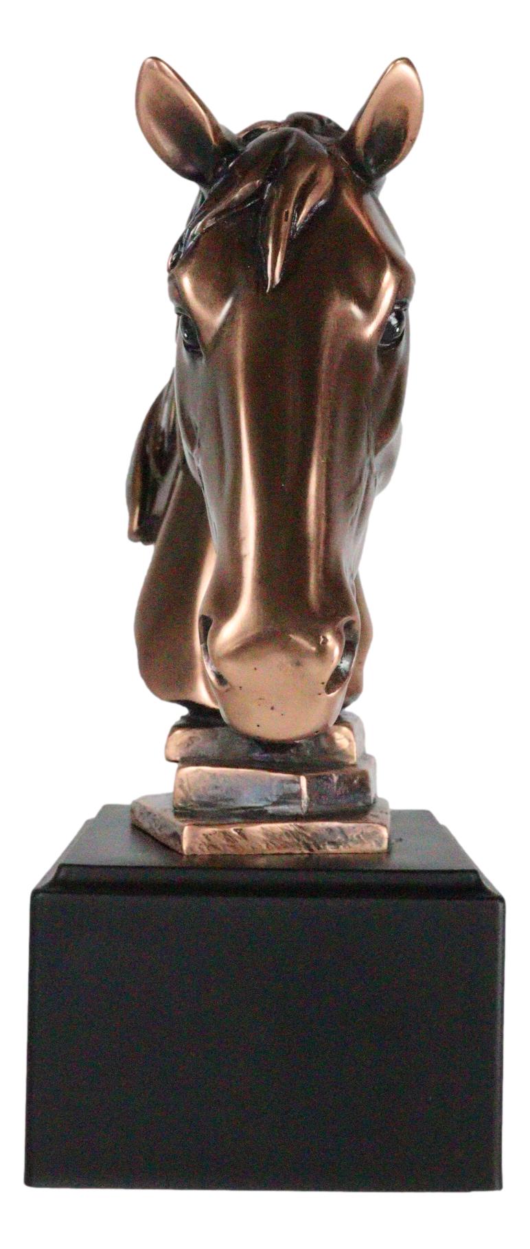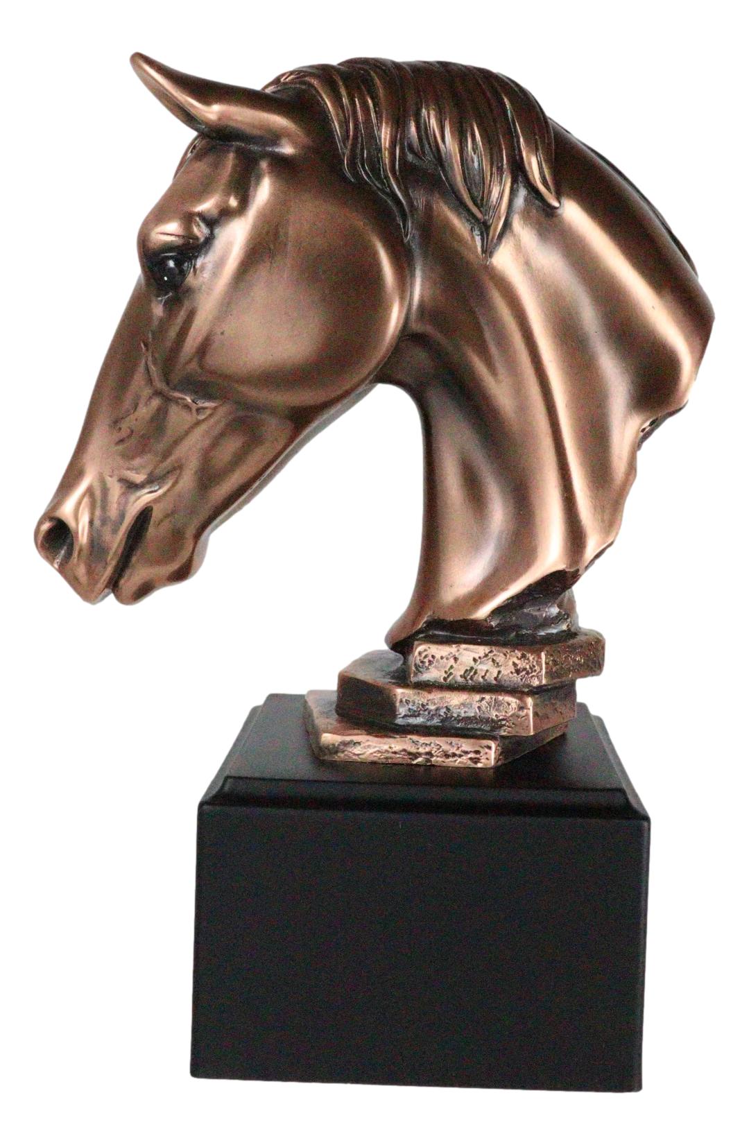 • This Beautiful Horse Head Bust Sculpture with its base is 7.5" tall, 5" long and 3.25" deep approximately. It weighs about 1.5 pounds. The base measures 2.25" tall and 3.25" wide. • This Beautiful Horse Head Bust Sculpture is made of the highest quality resin, undergoing the process of bronze electroplating giving it a uniform shine on the inside as well as the surface of the figurine. To add sculptural aesthetics and display worthiness, we add accent faux black wooden base to the sculpture. • Animal sculptures bring rustic, spiritual and nature's charm to your decore setup. We bring you these animal features in several different species, masterfully sculpted to resemble their real life counterparts. • This magnificent piece captures in realistic detail the beauty, strength and grace of the equine horse. • Props in photos are not included with the item. Western Wildlife Handsome Horse Stallion Head Bust Figurine With Trophy Base