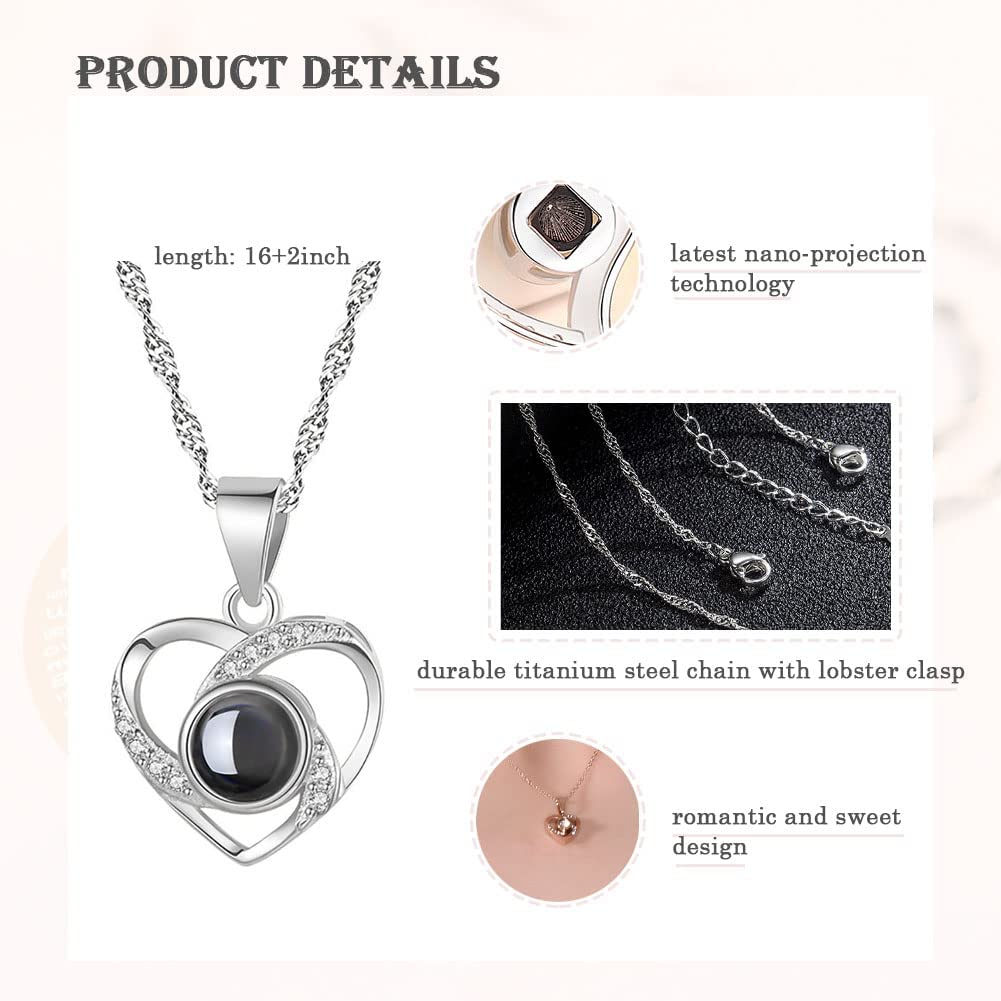 - Heart Photo Necklace: The projection necklace uses the latest nano-projection technology to express "I love you" in 100 different languages and record your memories and important moments, which is romantic and meaningful. The clearer the uploaded picture, the better the effect. You can choose from picture-only style or "I Love You" in 100 languages + picture style.