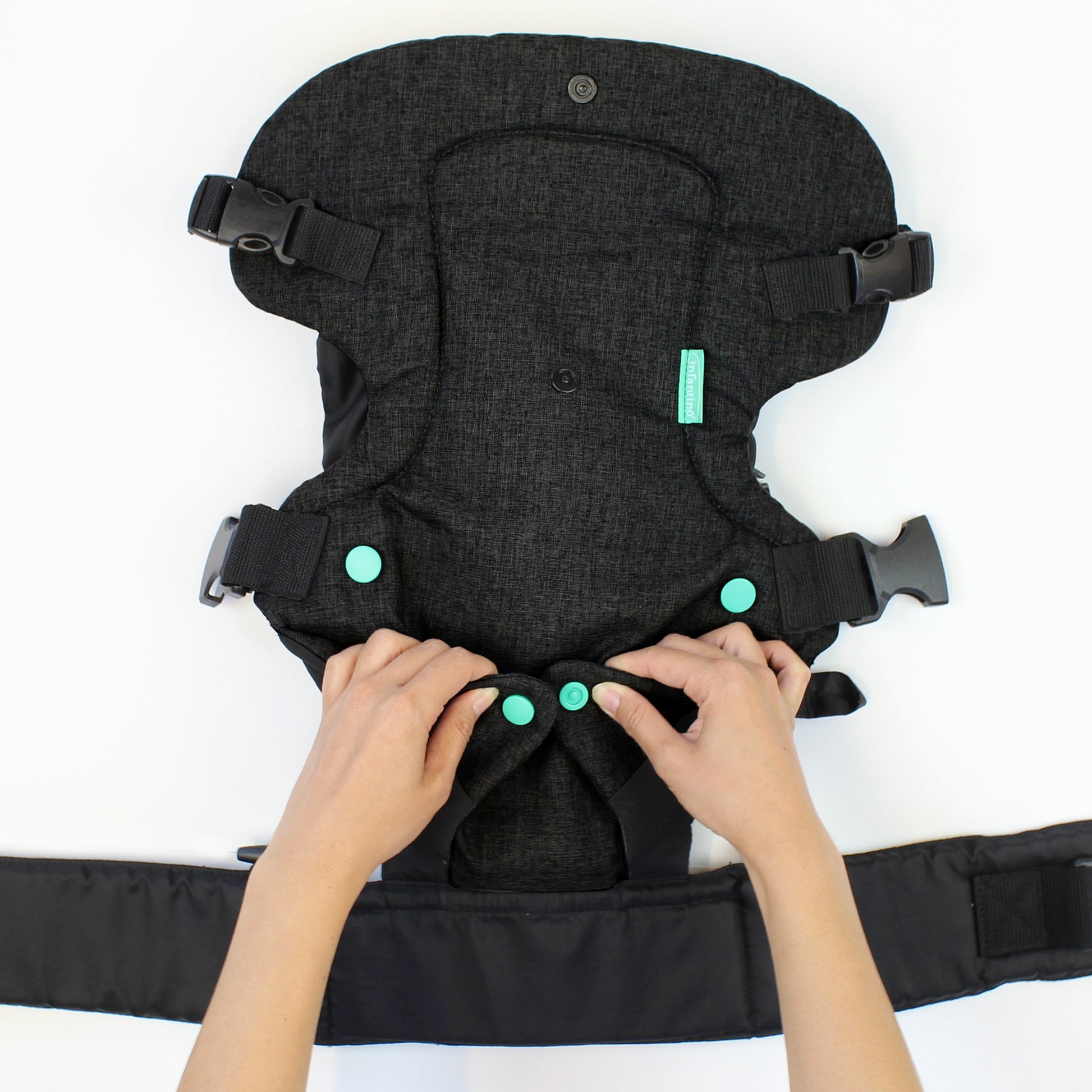 This soft carrier from Infantino supports newborns in a variety of comfy positions. Infantino Flip Advanced 4-in-1 Convertible carrier Extra padded adjustable shoulder straps 4 ergonomic carrying positions that transition as they grow Adjustable waist-belt, leg openings, and side straps Comes with a washable Wonder Cover bib Waist-belt transfers baby's weight to hips for extra comfort Designed for newborns 8 - 32 lbs. Machine wash cold Imported