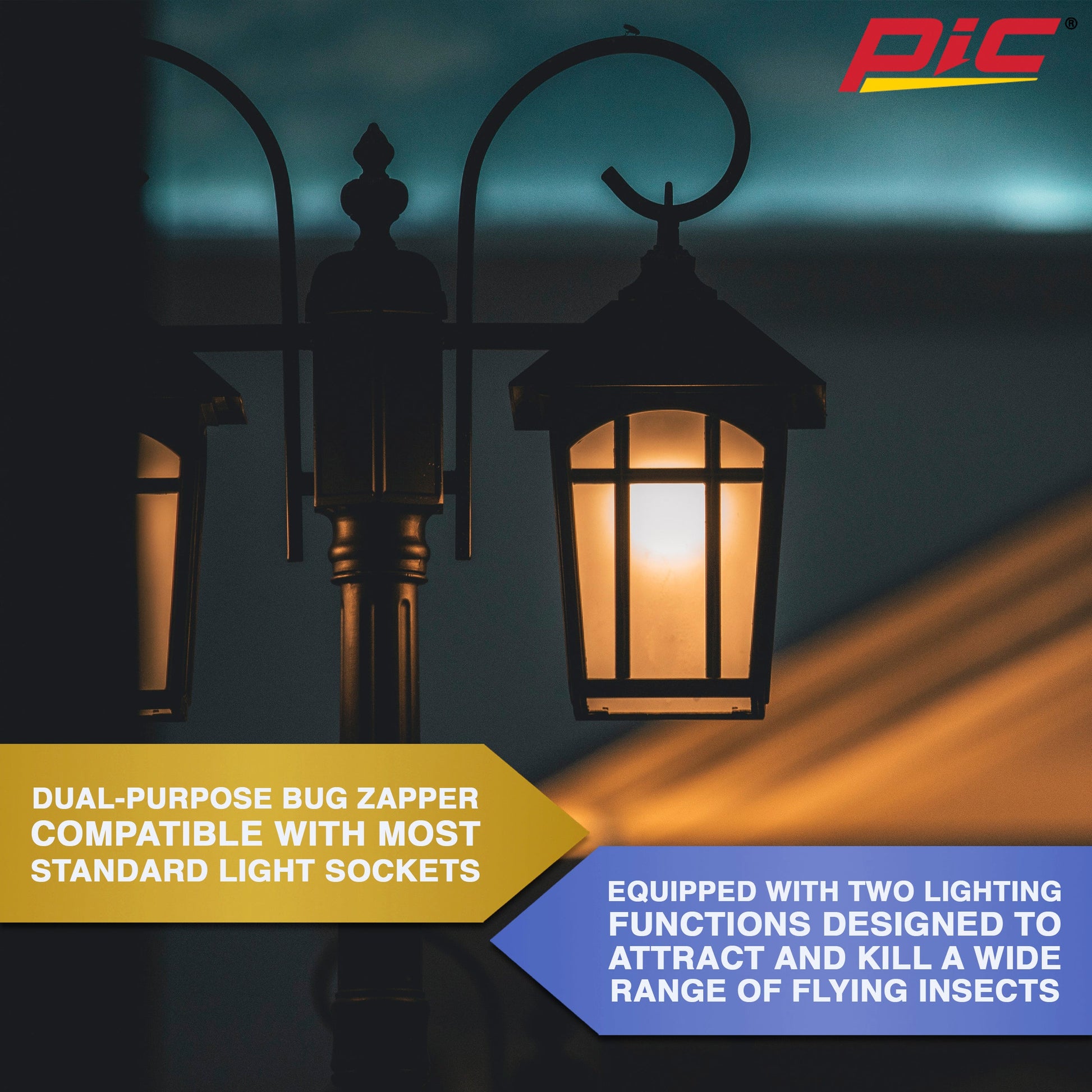 Pest Free Living Insect Killer bulb is a dual-purpose bug zapper compatible with most standard light sockets. The E26 fixture size fits most standard light sockets for indoor lighting fixtures and outdoor lanterns. It is equipped with two lighting functions designed to kill a wide range of flying insects including: moths, flies, gnats and mosquitoes. Flip the electrical switch once to turn on the LED light and zapper function, flip it a second time to activate only the zapper function and a third time to turn all functions off. It is recommended to place the bulb in an open outdoor lantern when using the bug zapper to reduce the population of flying insects in outdoor living areas. Lanterns with glass coverings will reduce the effectiveness of the bulb. The added catch tray allows for an easy to clean zapper without putting the user close to the zapping grid. The LED is rated as 195 lumens and has an estimated energy cost of $0.36 per year. *- Fits standard light bulb base *- Insecticide-free solution *- 3W LED warm light *- E26 (Light sockets) standard medium base *- For indoor/outdoor use *- 195 lumens *- Used with or without zapper