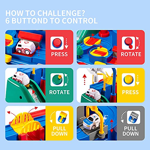 - PERFECT CHILDREN'S TOY SET - This car adventure toy has the perfect design, with 6 buttons and 8 different challenges, 3 mini cars: police car, ambulance, red fire truck(or yellow taxi). It helps to train and improve children's motor skills and hand-eye coordination by guiding children through every obstacle and challenge.