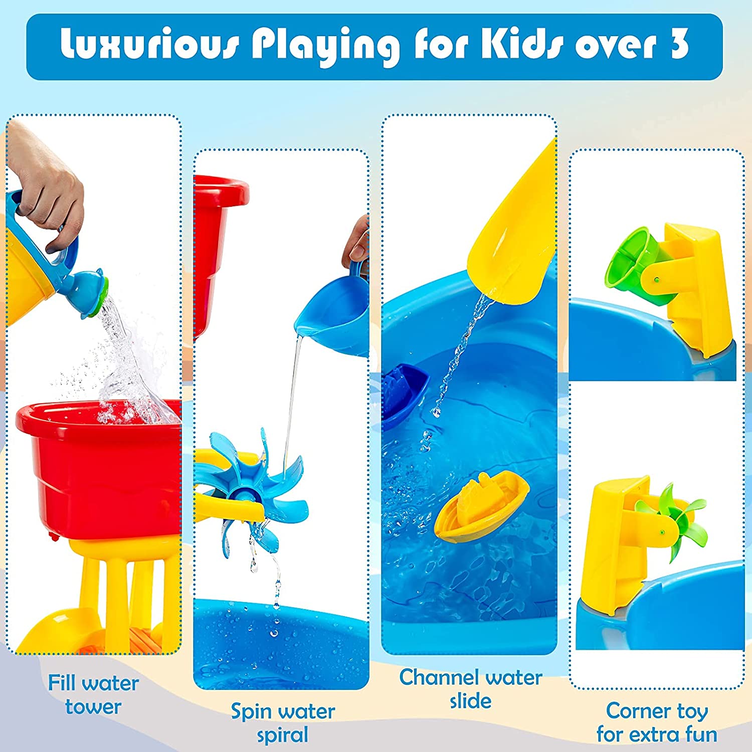 - ✨18Pcs Accessories & Umbrella Hole: 18 pieces of accessories include sand bucket,sand mold,conch cup,truck,water kettle,water tower, basket, rake,shovel,boat toy,corner toy,water spiral, water slide to create water park for more fun. Designed with an umbrella hole (umbrella not included), the sensory table can be used indoors and outdoors.