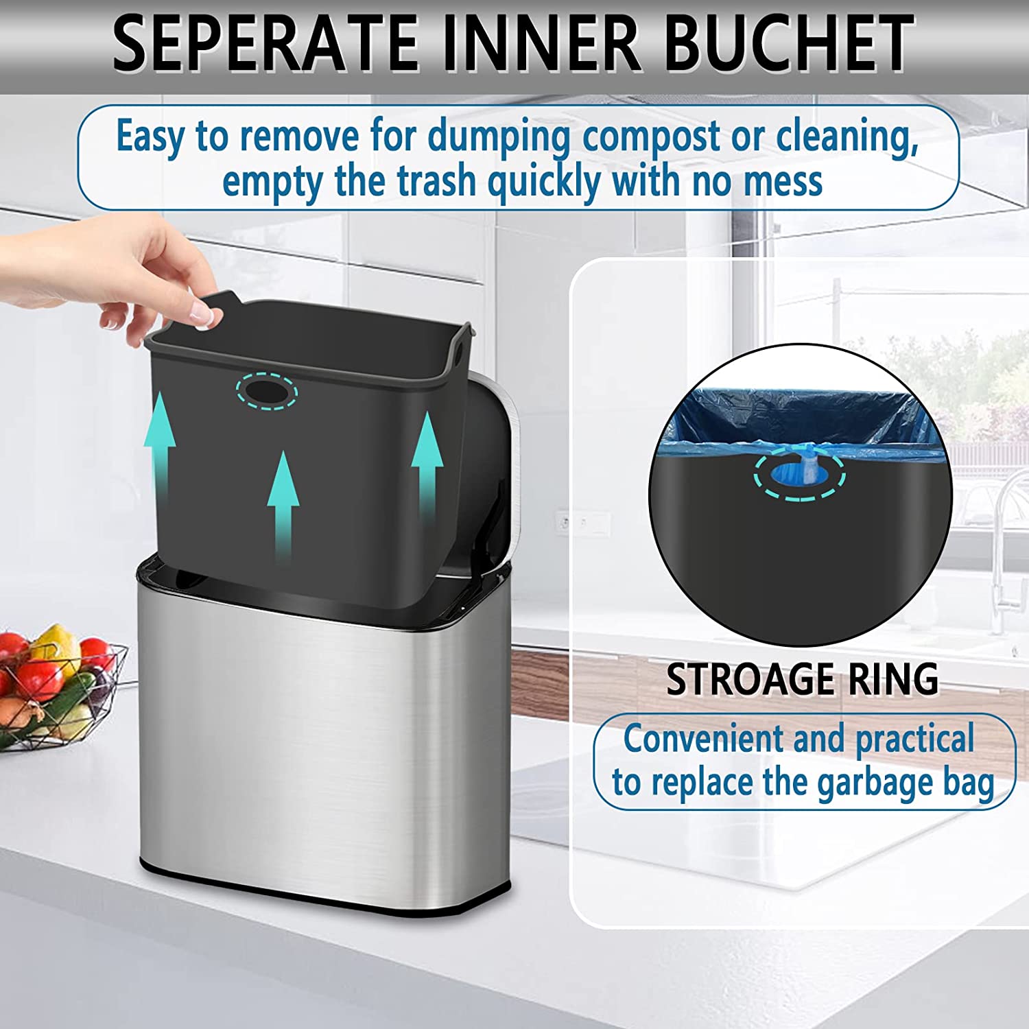 - ✅【REMOVABLE INNER BUCKET】Inner bucket can hold a large amount of food scraps and is easy to remove for dumping compost or cleaning, empty the trash quickly with no mess, no crevices for dirt, liquids to get trapped inside