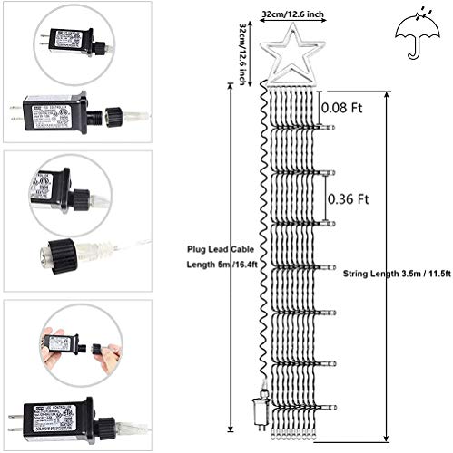 - 【PERFECT CHRISTMAS OUTDOOR DECORATIONS LIGHTS】.These outdoor christmas tree lights with Star works great with trees from around 8 feet to 13 feet tall.Start by hanging the star on the top of your tree. Then attach the 9 lines little star lights to the biggest star and let them drape to the ground, following the shape of the tree.It looks like star glittering in the night sky. It will be a beautiful addition to your outdoor decorations